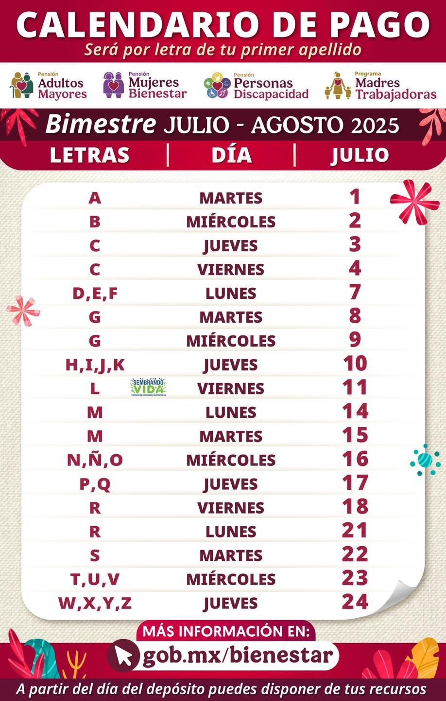 La dispersión de los depósitos en las Tarjetas Bienestar se realizará del 1 al 24 de julio, conforme a la primera letra del apellido.