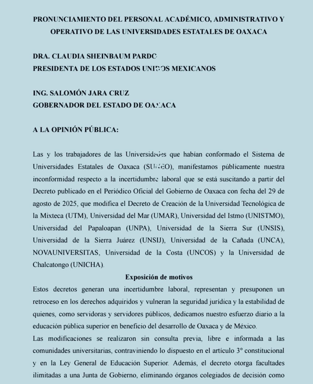 Las y los trabajadores de las Universidades que habían conformado el Sistema de Universidades Estatales de Oaxaca (SUNEO), manifestamos públicamente nuestra inconformidad respecto a la incertidumbre laboral que se está suscitando a partir del Decreto publicado en el Periódico Oficial del Gobierno de Oaxaca con fecha del 29 de