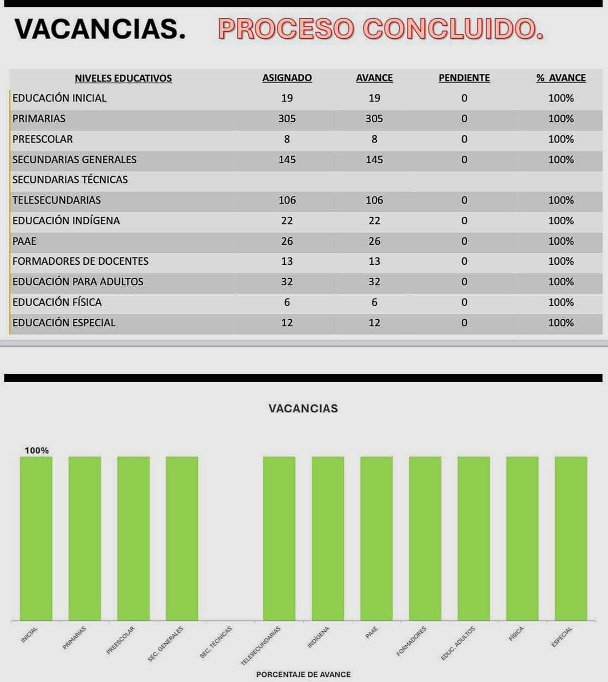Teniendo por concluido al 100% los procesos de vacancia, incidencias y nuevas necesidades.