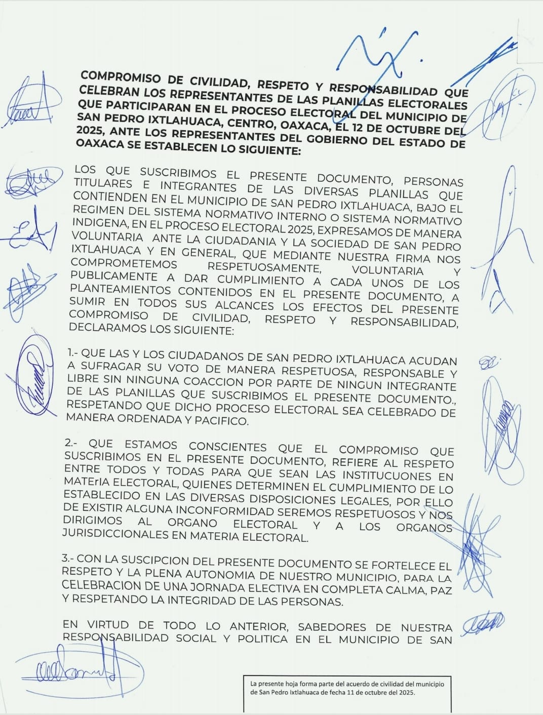 Oaxaca de Juárez, Oax.– En un ejercicio de diálogo y compromiso con la democracia, las candidatas y los candidatos de San Pedro Ixtlahuaca firmaron este sábado el Acuerdo de Civilidad y Seguridad, con el que se comprometieron a que la jornada electoral a celebrarse este 12 de octubre, se lleve a cabo de manera pacífica, ordenada y respetuosa.