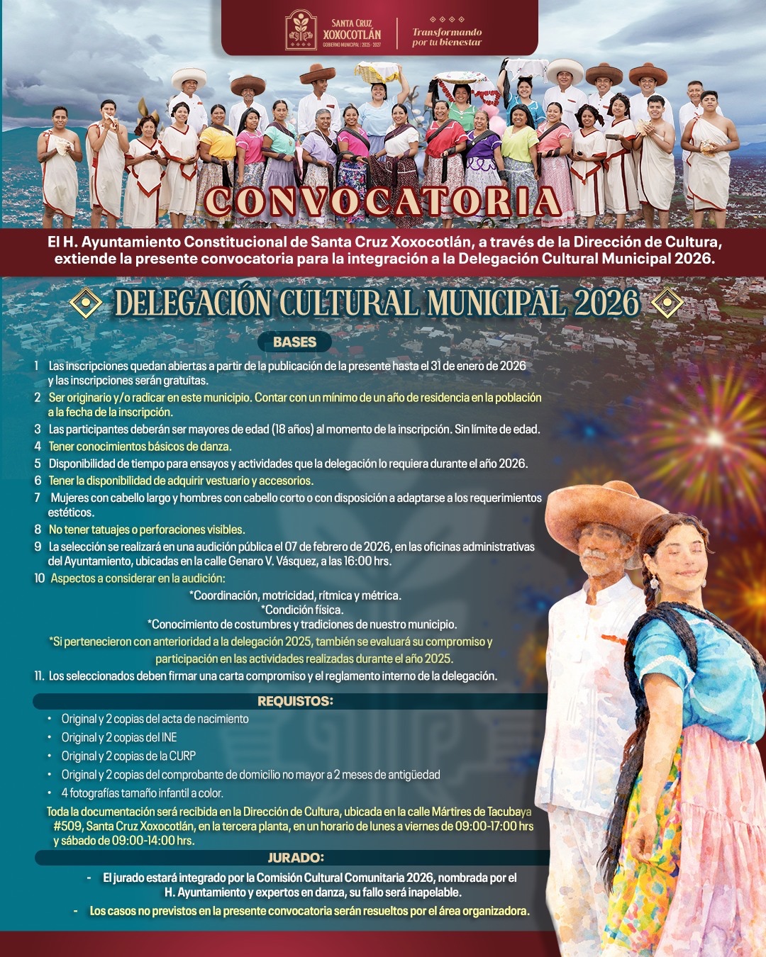 La Delegación Cultural Municipal 2026 no solo representa una agrupación artística, sino una oportunidad para que las y los xoxeños lleven al escenario la historia, la tradición y el espíritu de su pueblo, fortaleciendo el legado cultural que distingue a Santa Cruz Xoxocotlán.