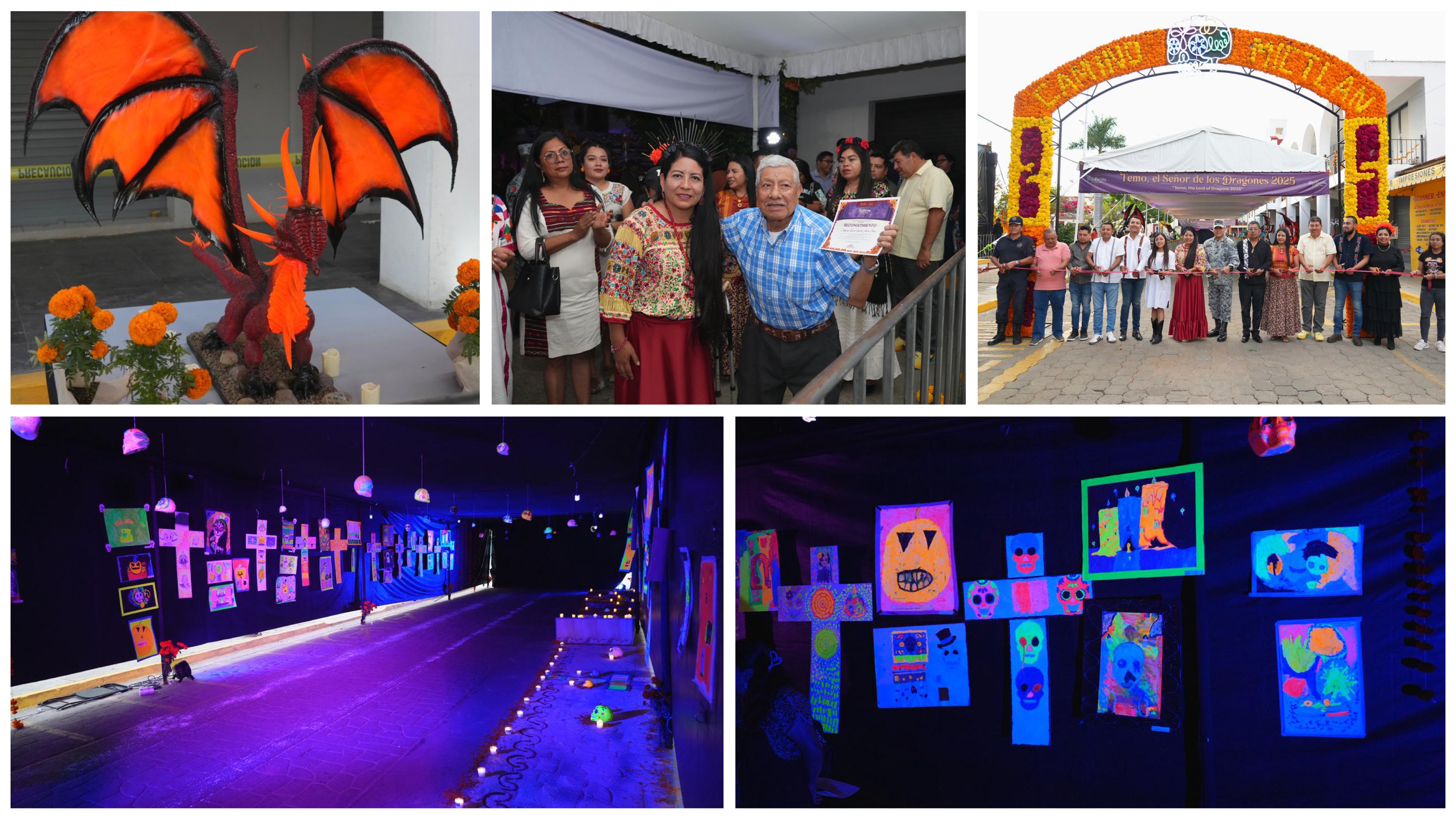 El arte también cobró vida con las creaciones del maestro Eloy Pérez Aquino, cuyas piezas dialogan con la memoria y honran a quienes habitan el recuerdo. Niños y jóvenes participaron con una exposición de pinturas neón, resultado de talleres impulsados por el Ayuntamiento, mientras que una muestra de piezas prehispánicas recordó el origen ancestral del culto a la muerte, símbolo de respeto y continuidad.