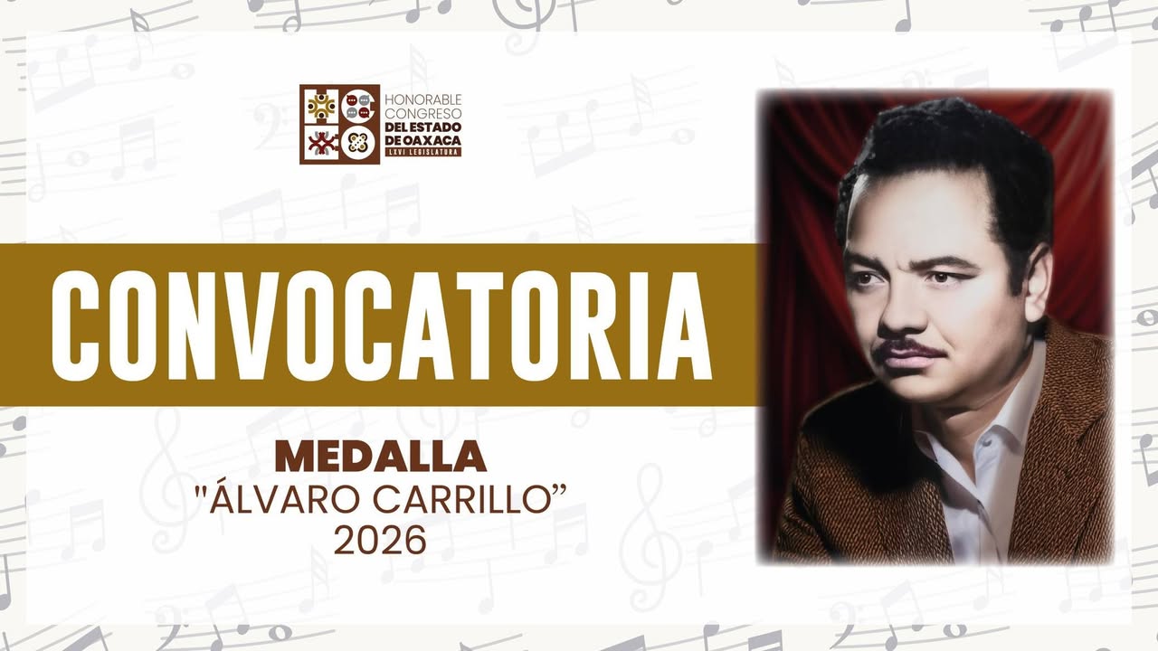 La LXVI Legislatura del Congreso del Estado emitió la convocatoria para participar en el proceso de postulación a la Medalla “Álvaro Carrillo” 2026, con el objetivo de reconocer a quienes, por su trayectoria y aportaciones, han fortalecido la música como una manifestación cultural de identidad y patrimonio del pueblo oaxaqueño.