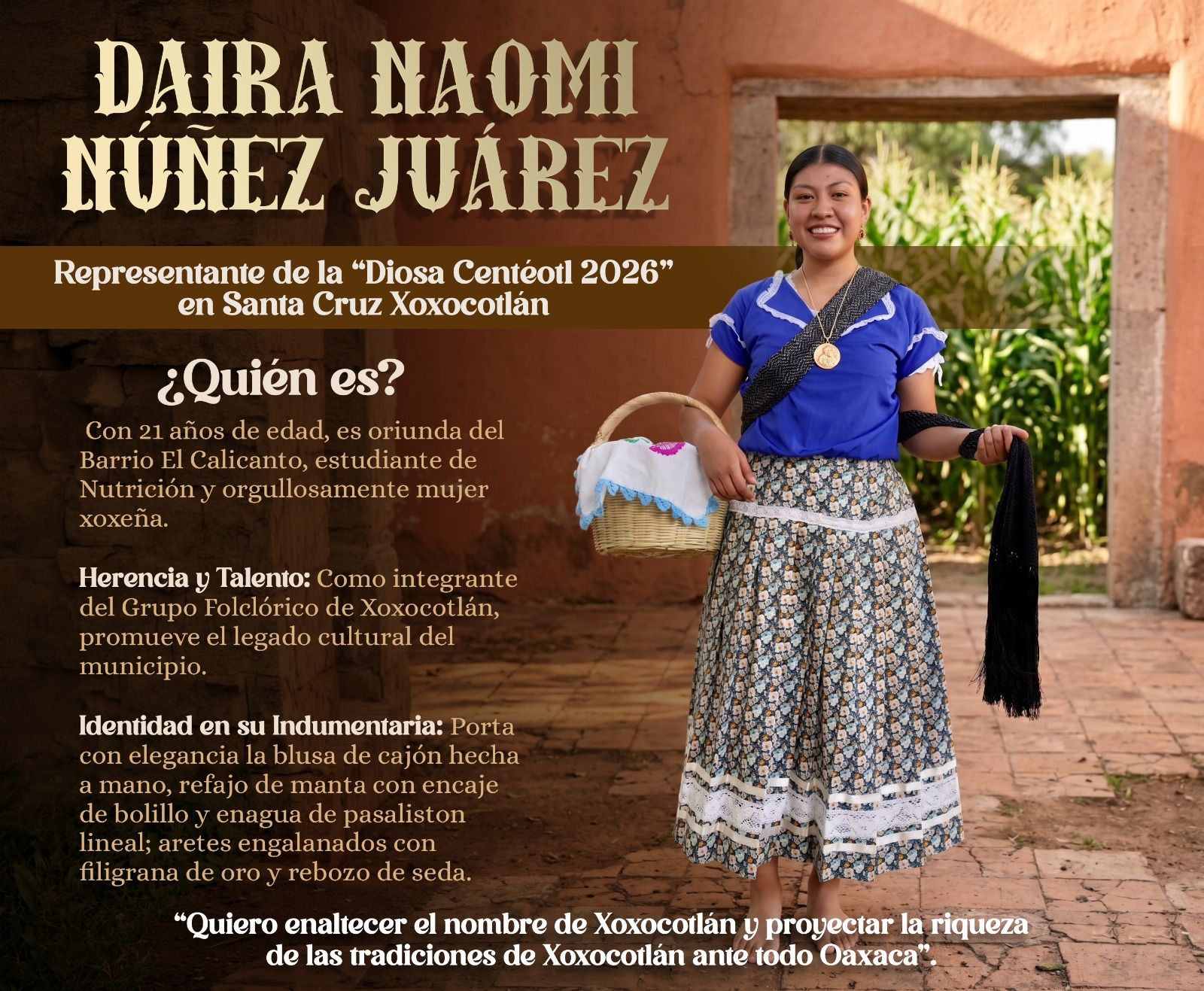 Daira Naomi Núñez Juárez fue elegida como representante oficial de Xoxocotlán para el certamen estatal “Diosa Centéotl 2026”.