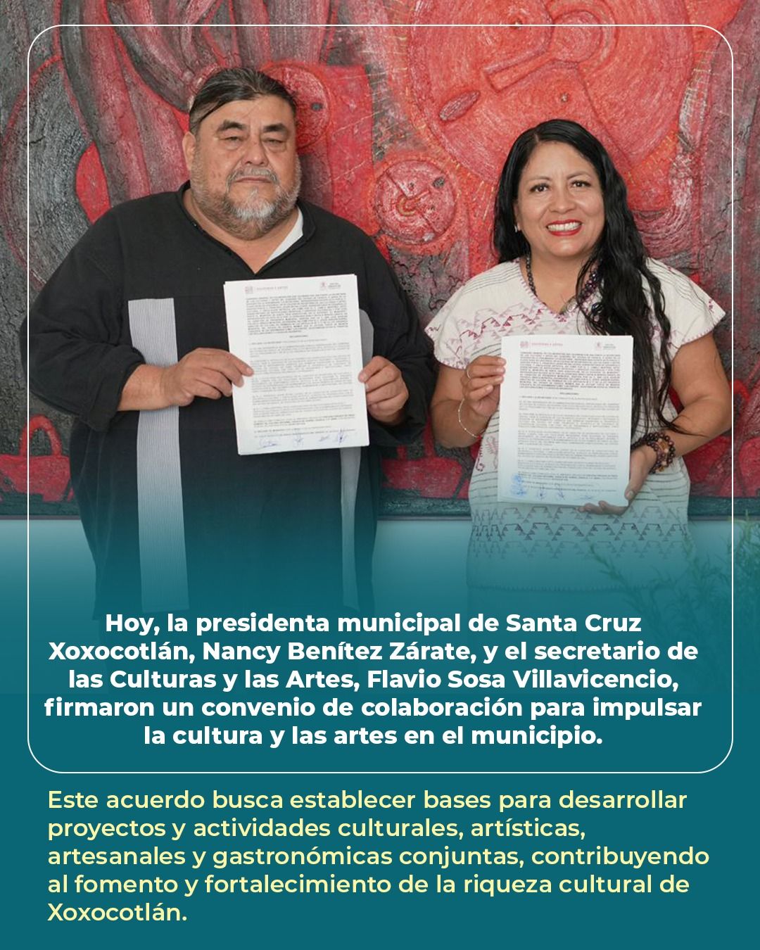 El Ayuntamiento de Santa Cruz Xoxocotlán y la Secretaría de las Culturas y las Artes (SECULTA)firmaron un convenio de colaboración para impulsar la cultura y las artes en el municipio.