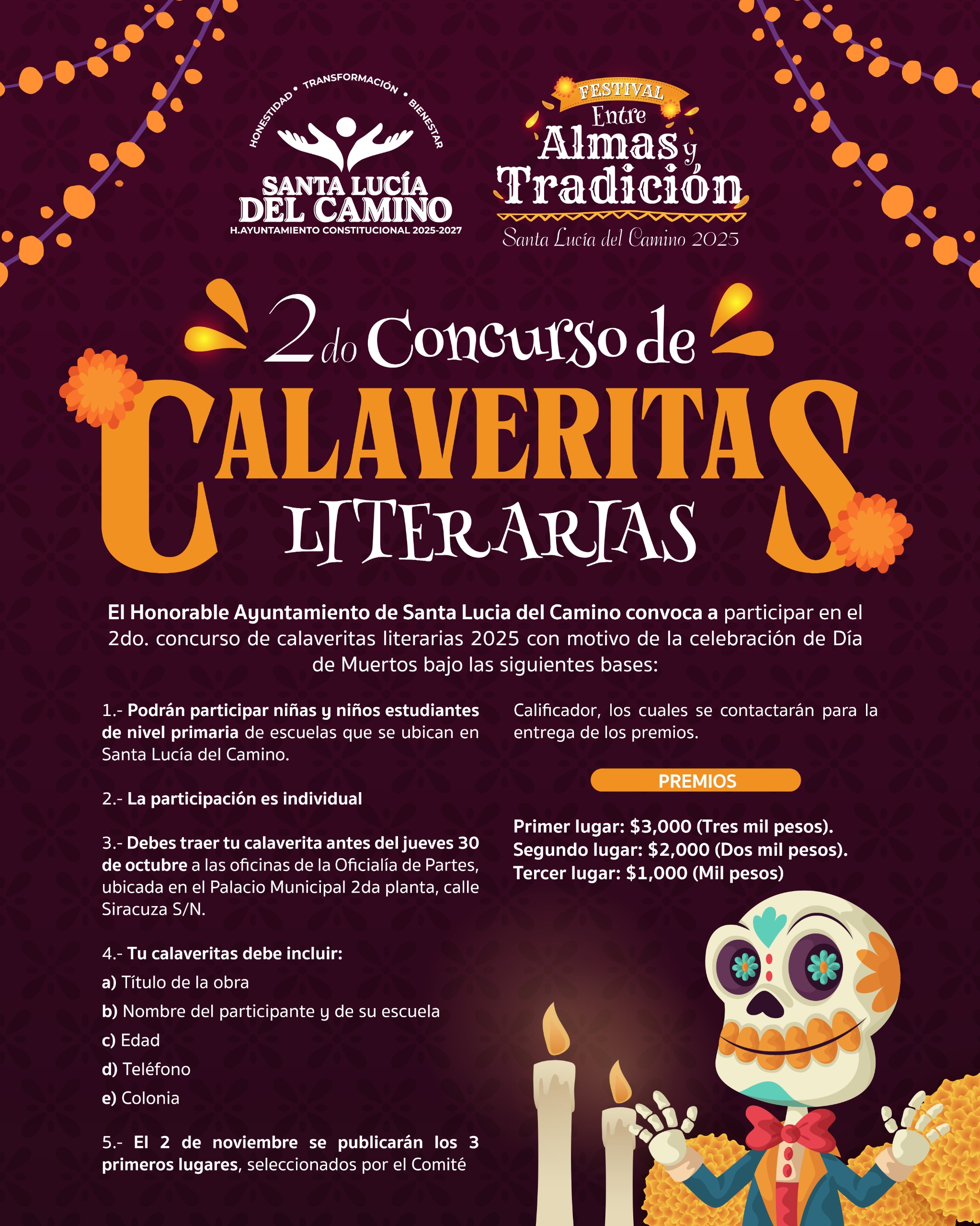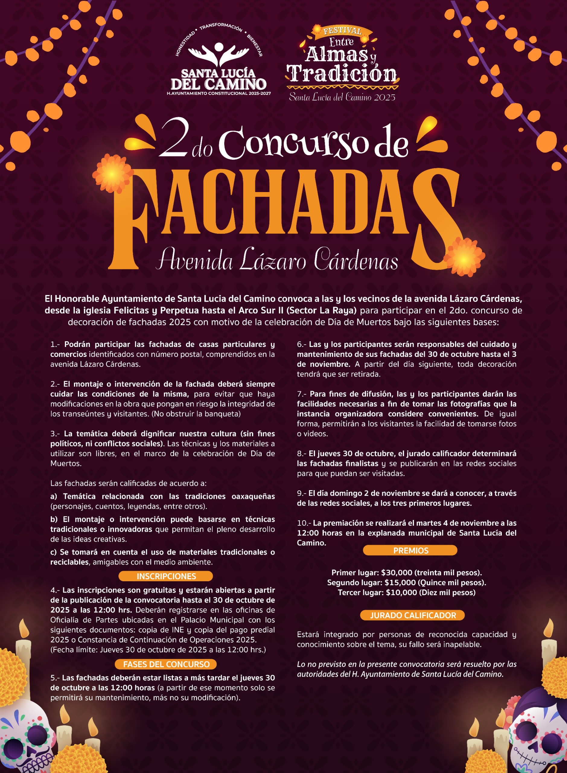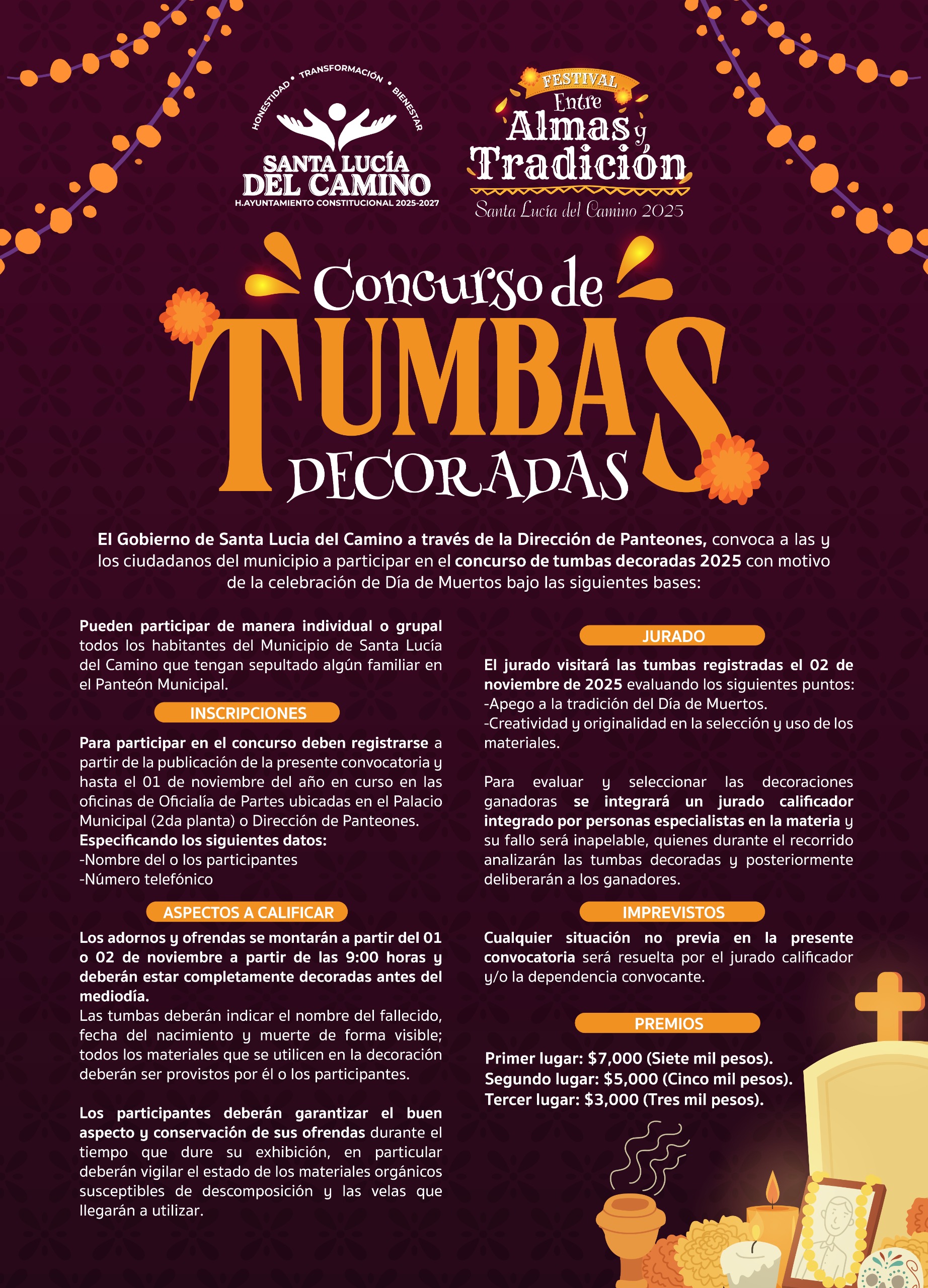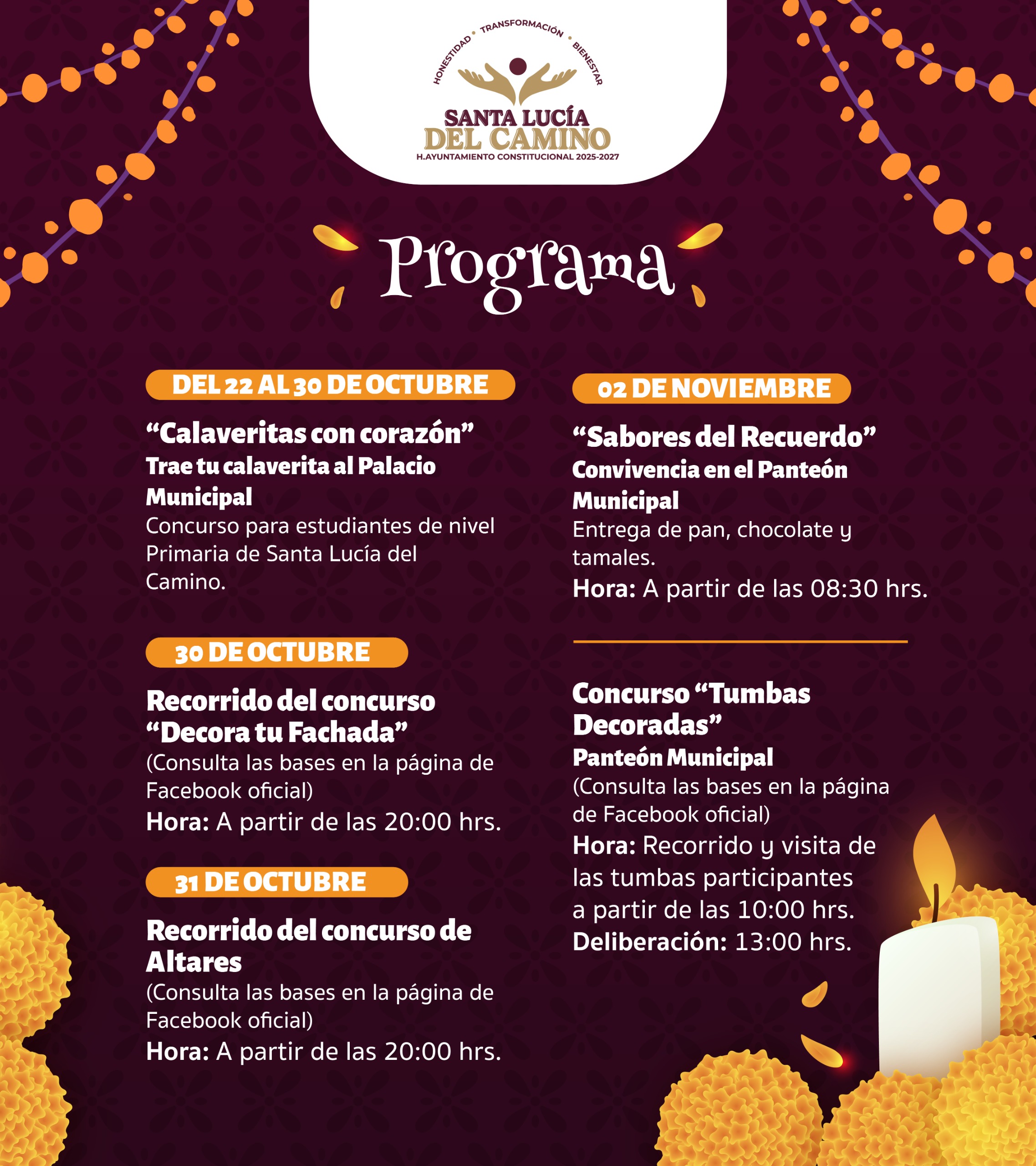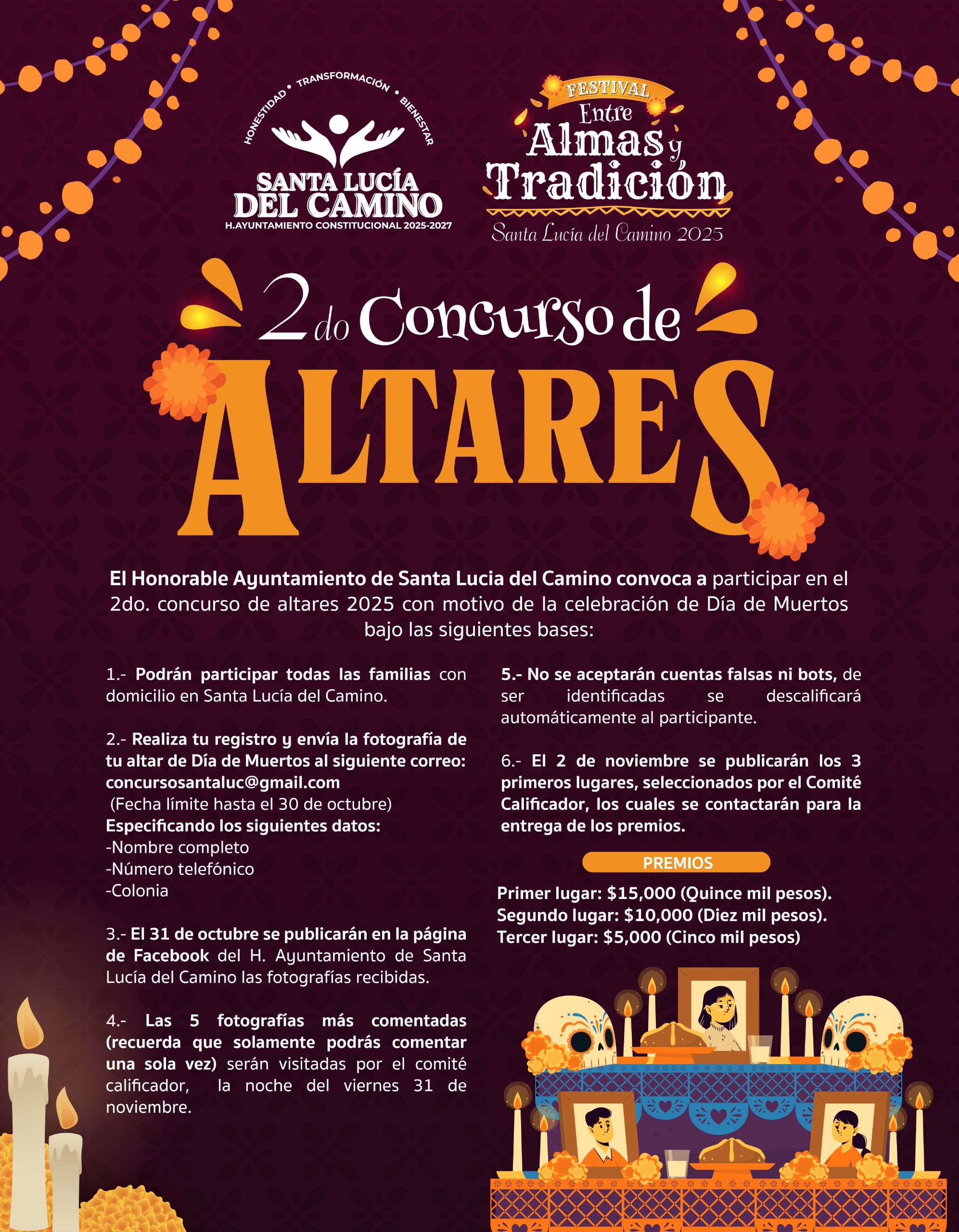 El Ayuntamiento de Santa Lucía del Camino, que encabeza el Edil Juan Carlos García Márquez, te invita a disfrutar del Festival Almas y Tradiciones 2025, así como a participar de los concursos de altares, calaveritas literarias, tumbas y fachadas, que tienen diversos premios económicos, y nos ayudan a fomentar la preservación de nuestras tradiciones y a unirnos como municipio.