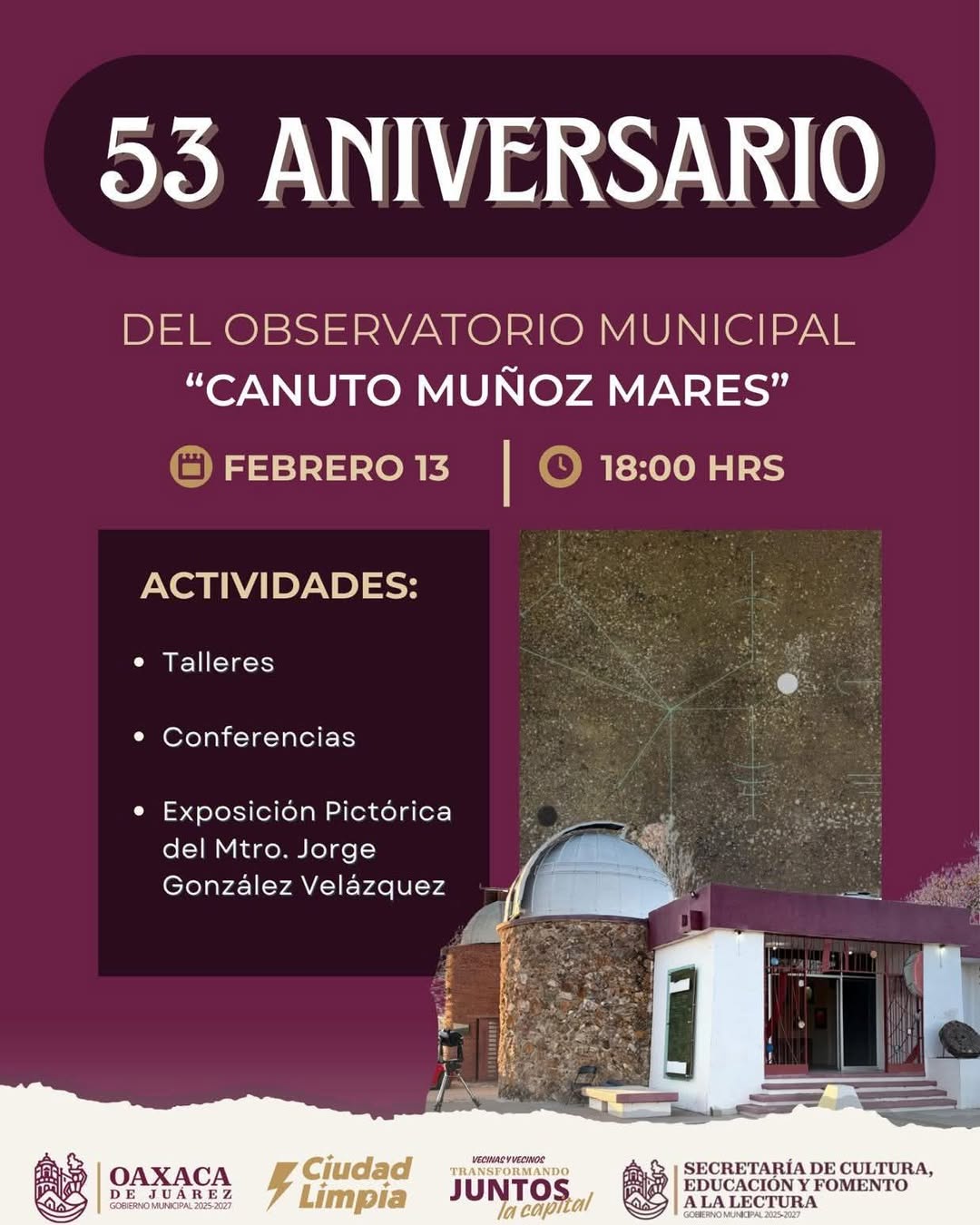 El Ayuntamiento de Oaxaca de Juárez, a través de la Secretaría de Cultura, Educación y Fomento a la Lectura, invita a vecinas, vecinos y visitantes a celebrar el 53 Aniversario del Observatorio Municipal “Canuto Muñoz Mares”, un espacio emblemático que promueve la divulgación científica, la educación y la participación comunitaria.