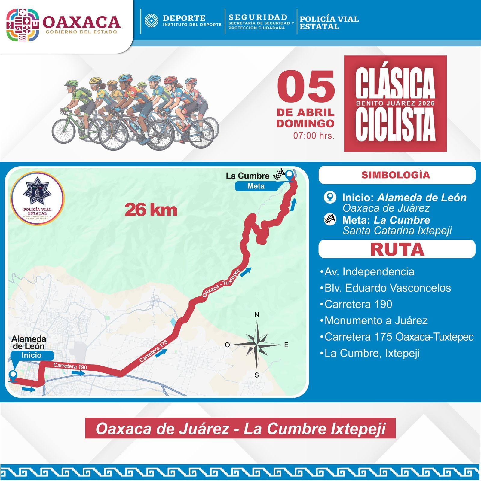 La Policía Vial Estatal desplegará un dispositivo de seguridad, protección y vialidad este domingo 5 de abril, con motivo de la Clásica Ciclista “Benito Juárez” 2026, que contempla las modalidades de ruta y montaña, la cual partirá del centro de Oaxaca de Juárez con destino a la Sierra Juárez, en la zona de La Cumbre Ixtepeji.