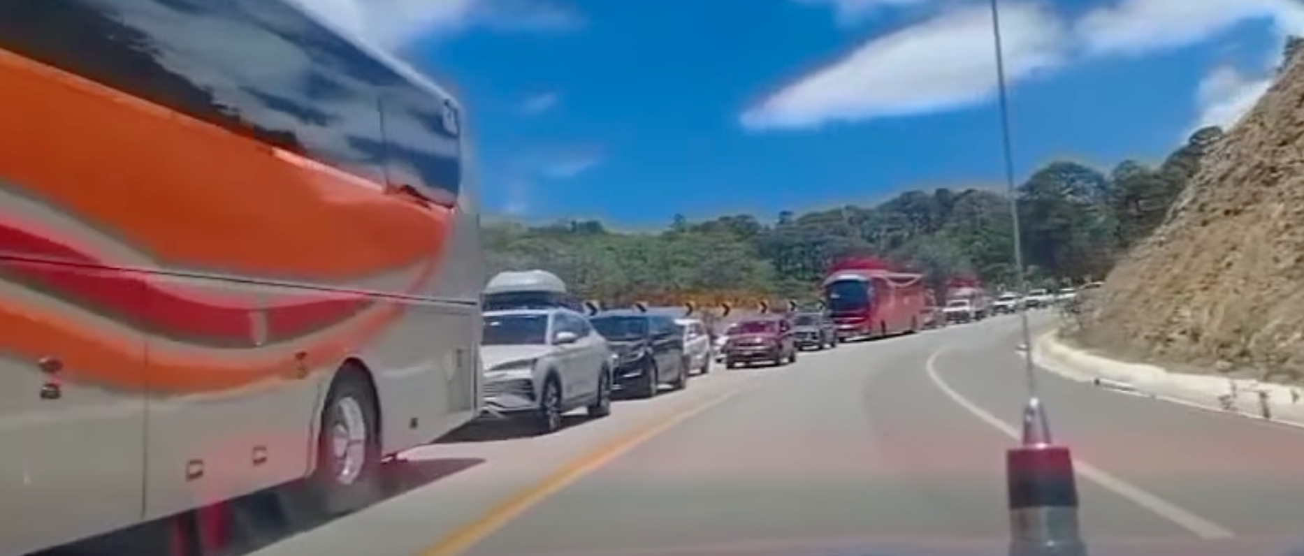 Usuarios reportan filas de hasta 3 kilómetros y tránsito a vuelta de rueda rumbo a Puerto Escondido y Oaxaca. Señalan tramos sin pavimentar, llenos de piedra, sin señalización ni presencia de la Guardia Nacional.