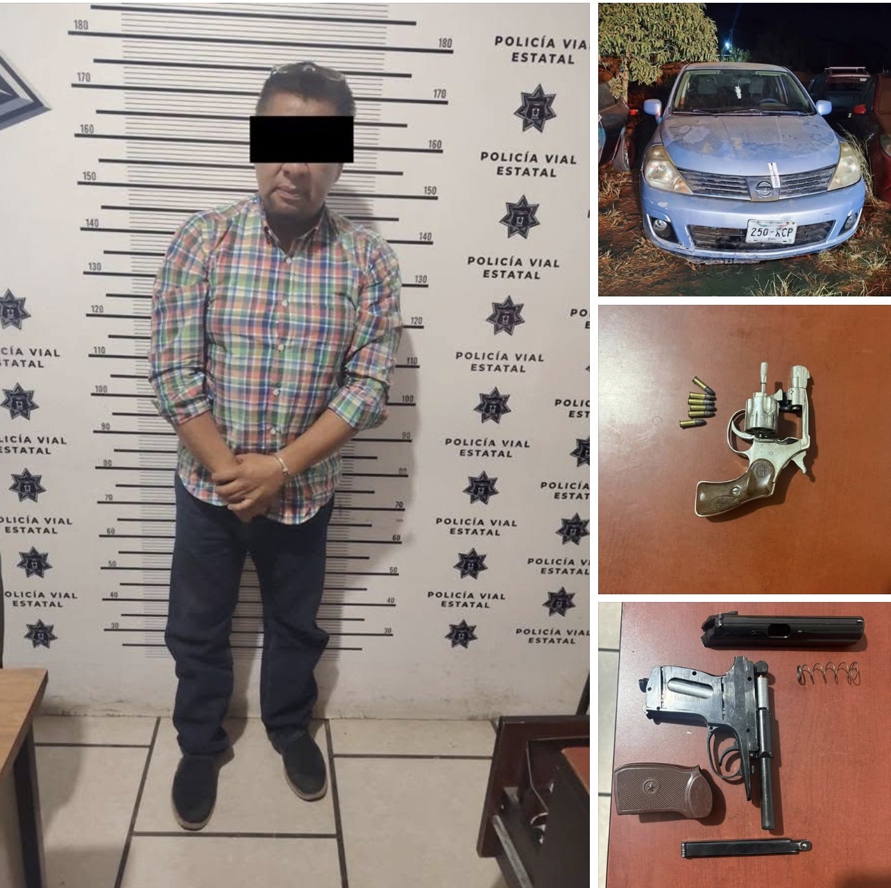 Elementos de la Policía Vial Estatal aseguraron a un masculino por la portación de un arma de fuego y detuvieron a otro por conducir un vehículo con reporte de robo activo, durante la implementación de los filtros de alcoholimetría “Salvando Vidas” en distintos puntos de la capital.