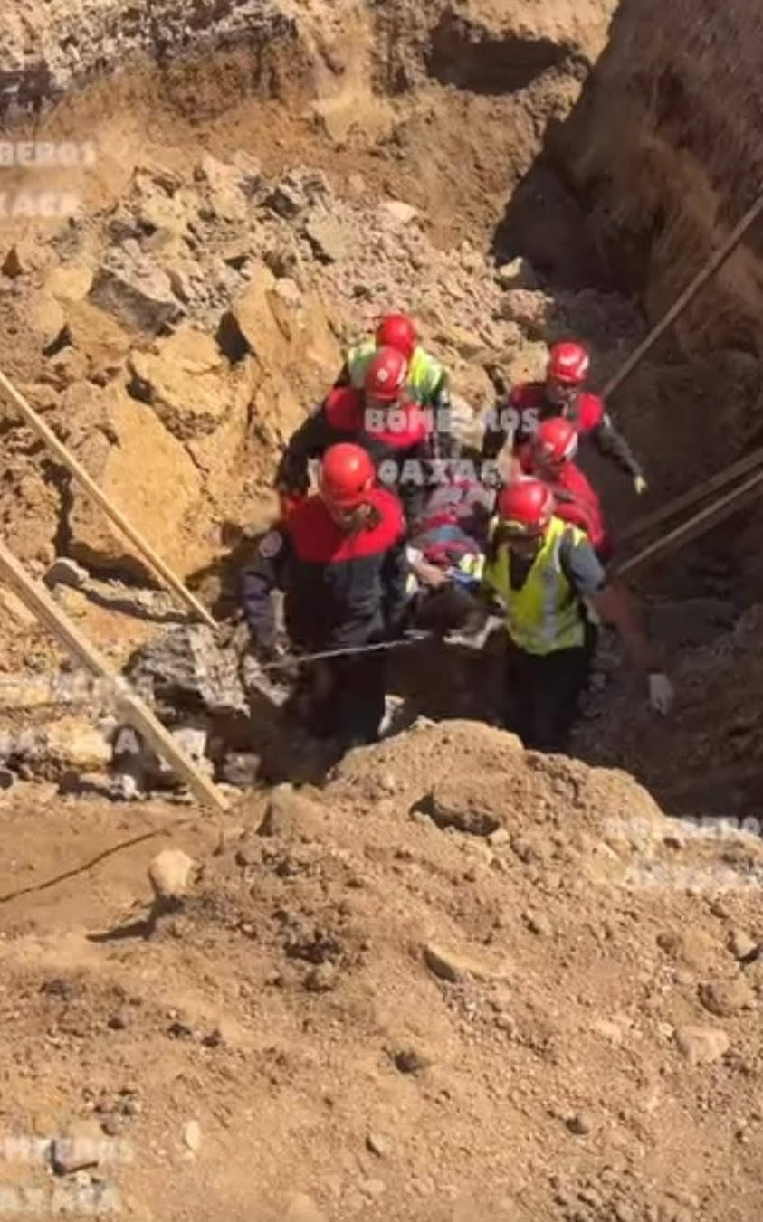Un hombre fue rescatado con vida por el Heroico Cuerpo de Bomberos del Estado de Oaxaca después de quedar atrapado en un derrumbe en una obra de drenaje en la Avenida La Campiña, Oaxaca de Juárez.