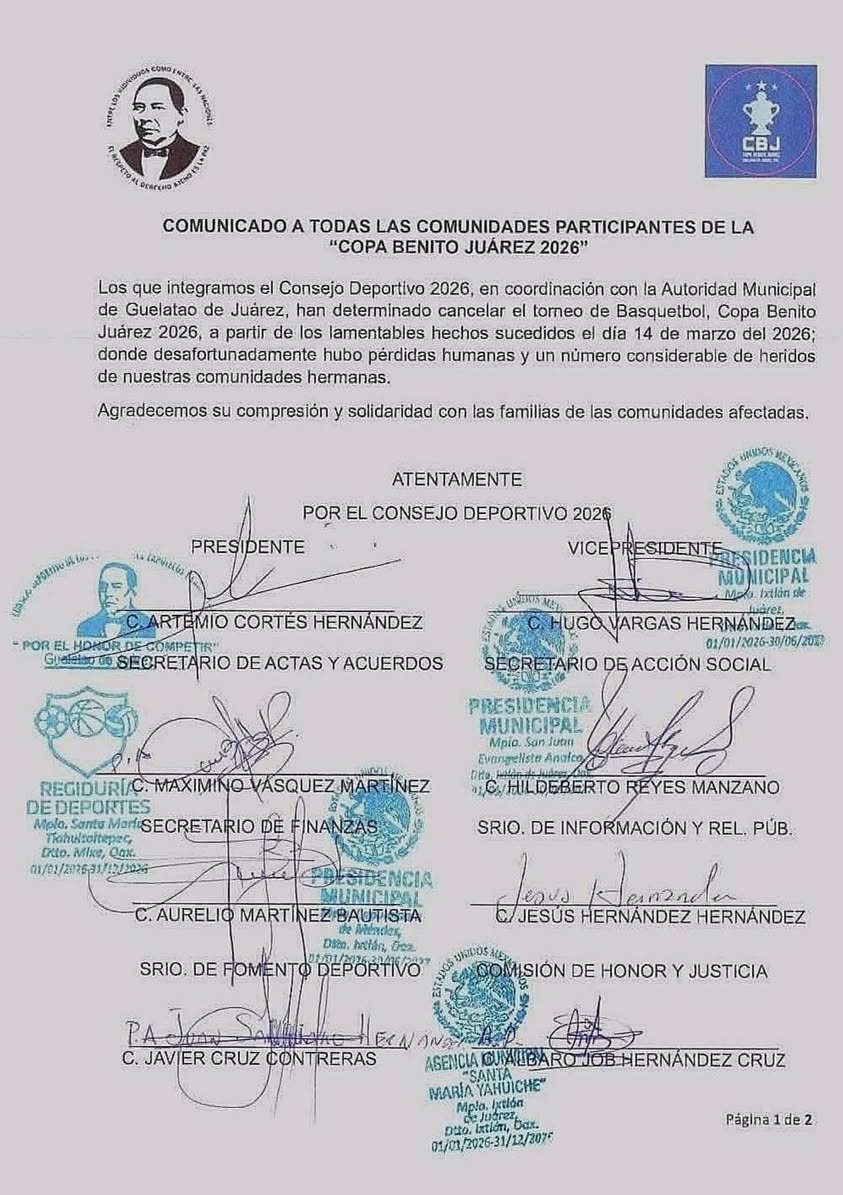 El Consejo Deportivo 2026, en coordinación con la Autoridad Municipal de Guelatao de Juárez, anunció la cancelación del torneo de basquetbol “Copa Benito Juárez 2026” tras los lamentables hechos ocurridos el sábado 14 de marzo, donde se reportaron pérdidas humanas y varios heridos de distintas comunidades y equipos participantes.
