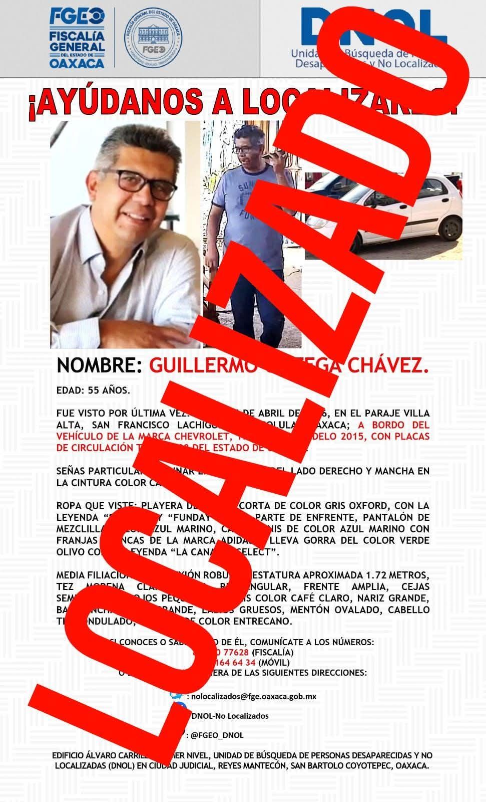 La Fiscalía General del Estado de Oaxaca (FGEO) realizó la localización con vida de Guillermo Ortega Chávez, de 55 años de edad, quien había sido reportado como no localizado, gracias a las acciones coordinadas con la Policía Estatal. Asimismo, la institución mantiene abiertas las líneas de investigación para determinar la posible comisión de otros delitos y ha implementado medidas de protección en favor de la víctima y su familia.