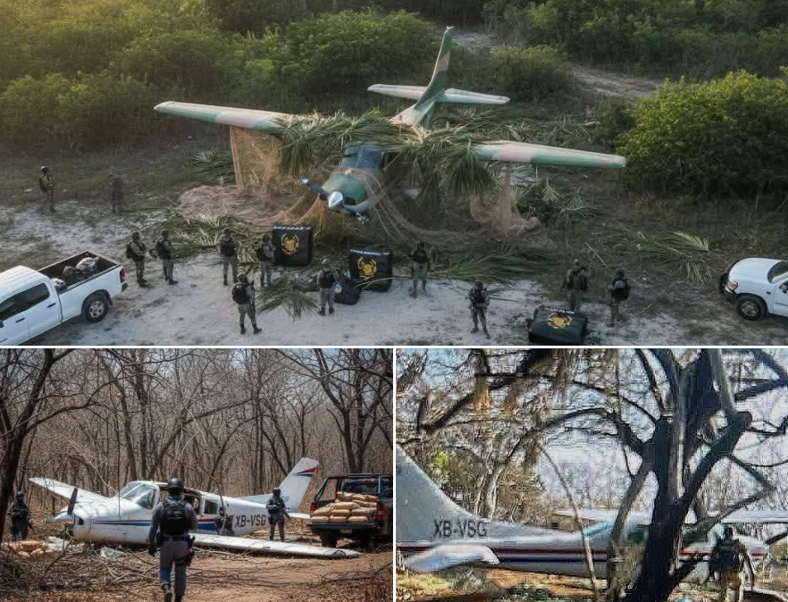 El camuflaje fallido: Cuando los elementos llegaron por tierra, encontraron la avioneta escondida entre árboles y palmeras, totalmente cubierta con redes y hojas para que no se viera desde el aire.