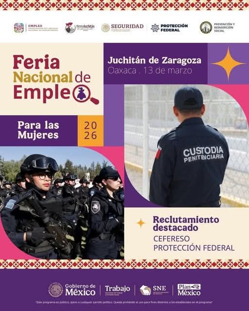 Debido al gran interés que han generado los reclutamientos para Oficial en Prevención Penitenciaria del CEFERESO 13, en Miahuatlán de Porfirio Díaz, así como para Protector de la Nación del Servicio de Protección Federal, este viernes ambas instituciones estarán informando y recibiendo postulaciones durante la Feria Nacional de Empleo para las Mujeres 2026.