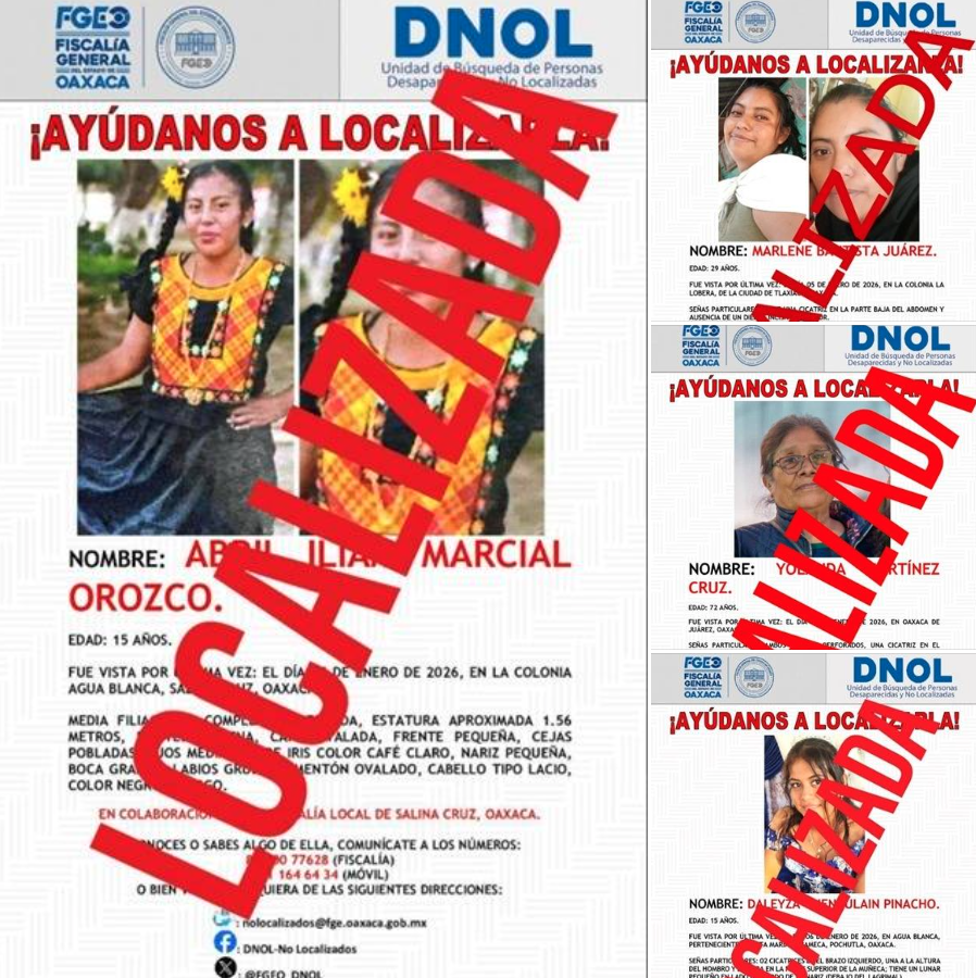 El primer caso corresponde a la adolescente A.M.O., de 15 años de edad, reportada como no localizada el 05 de enero de 2026 en Salina Cruz. Tras la denuncia, la FGEO inició los trabajos ministeriales y de campo que permitieron saber su paradero el 09 de enero en el domicilio de otros familiares, confirmándose que se trató de una ausencia voluntaria.
