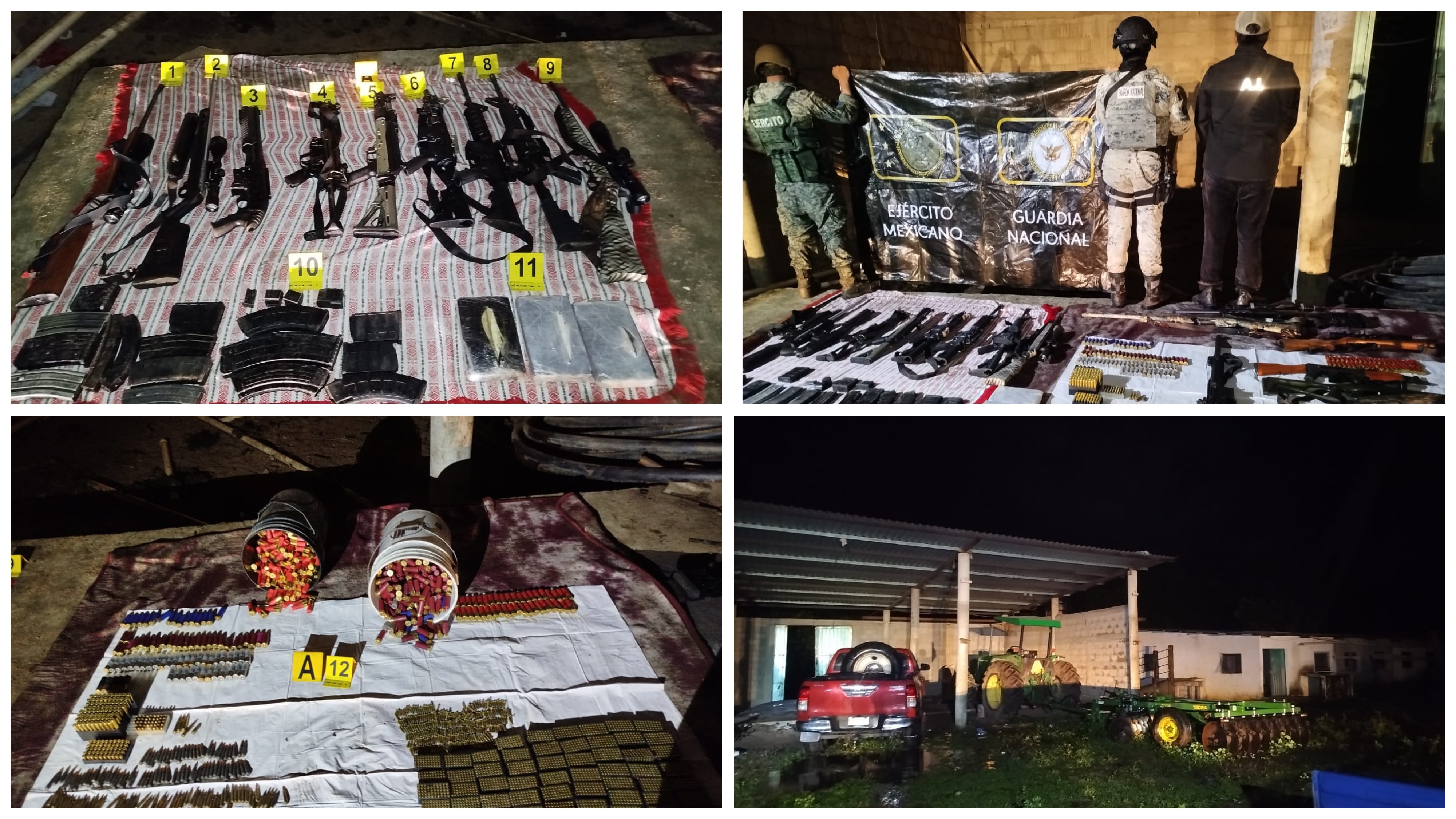 Gracias a los trabajos coordinados entre la Fiscalía General del Estado de Oaxaca (FGEO), a través de la Agencia Estatal de Investigaciones (AEI), junto con la Secretaría del Defensa Nacional (DEFENSA), Secretaría de Marina, Guardia Nacional y la Policía Estatal, se realizó un cateo al interior de un rancho donde se logró el aseguramiento de decenas de armas de fuego de diferentes calibres, así como de cientos de cartuchos útiles y vehículos, acción llevada a cabo en la región del Istmo de Tehuantepec.