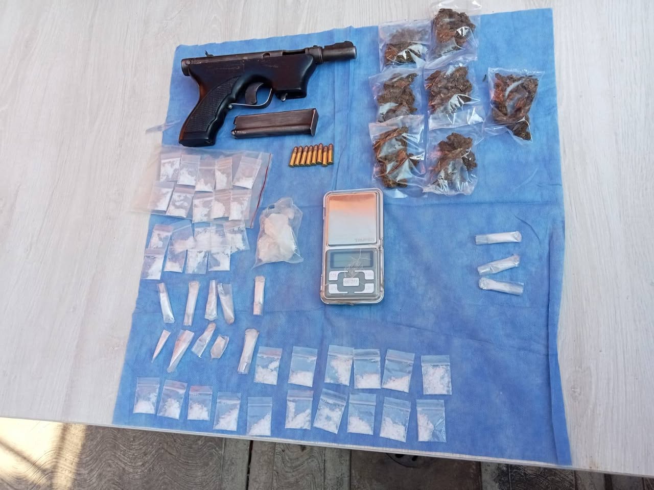 Además, se aseguraron diversas bolsas de plástico transparente que contenían una sustancia sólida con características similares a la droga conocida como cristal, así como bolsas con hierba verde seca con características propias de la marihuana, así como un arma de fuego, un cargador metálico abastecido con cartuchos útiles y una báscula gramera.