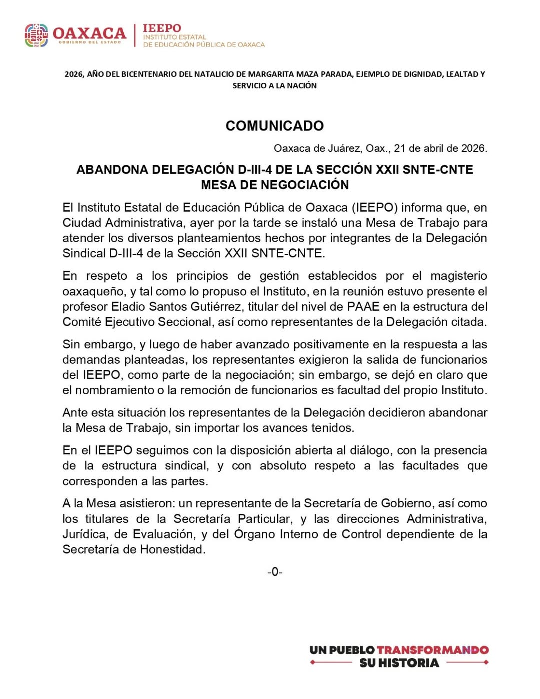 Abandona S-22 mesa de negociación