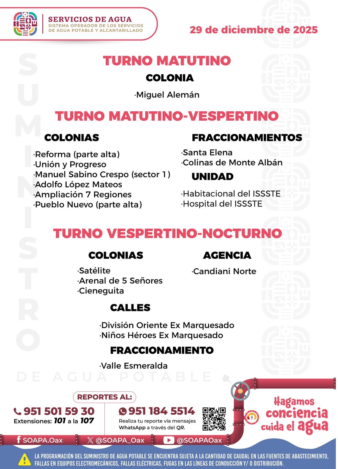 Agenda del suministro de agua potable de este lunes