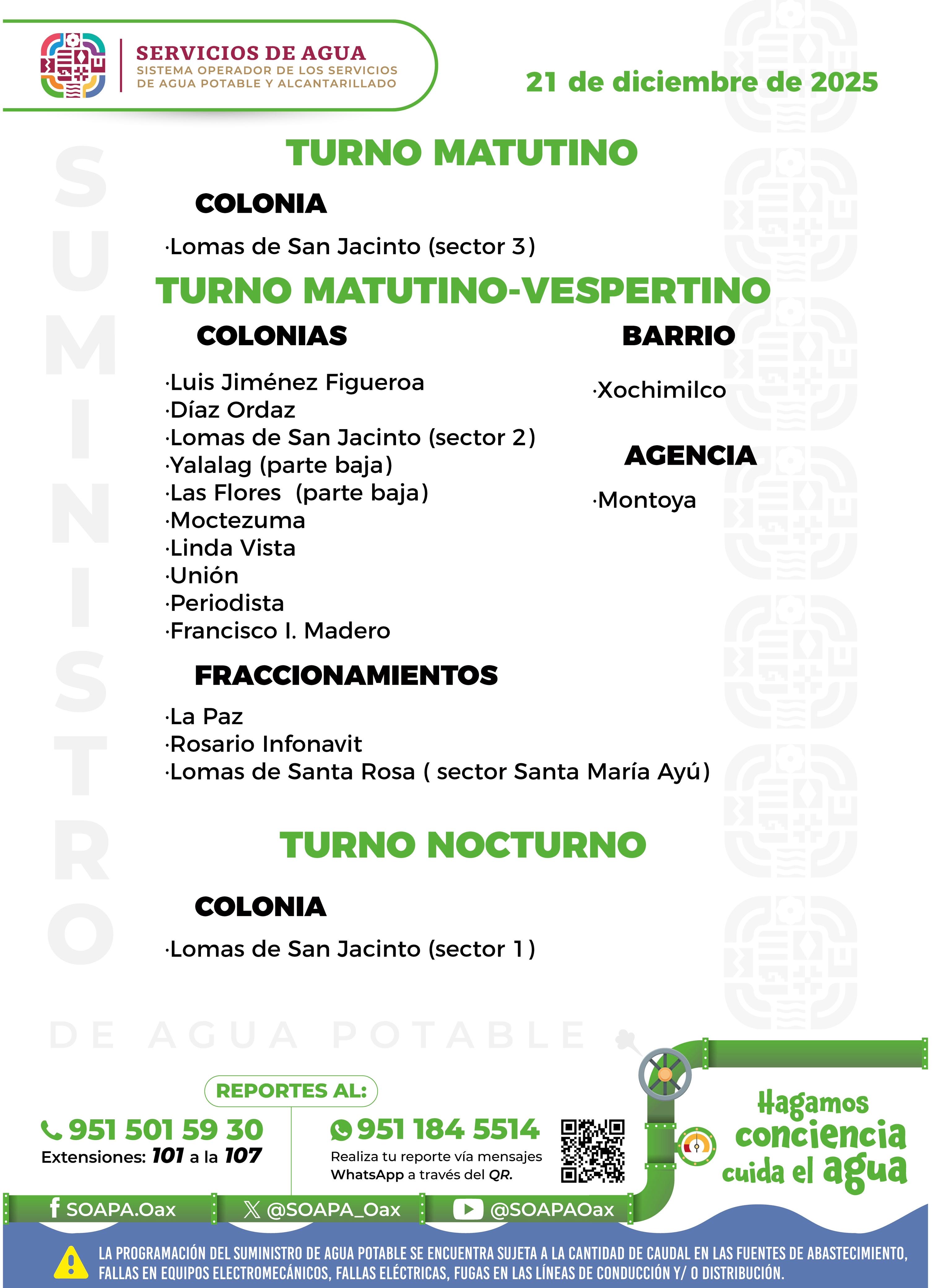 Agenda del suministro de agua potable para este domingo