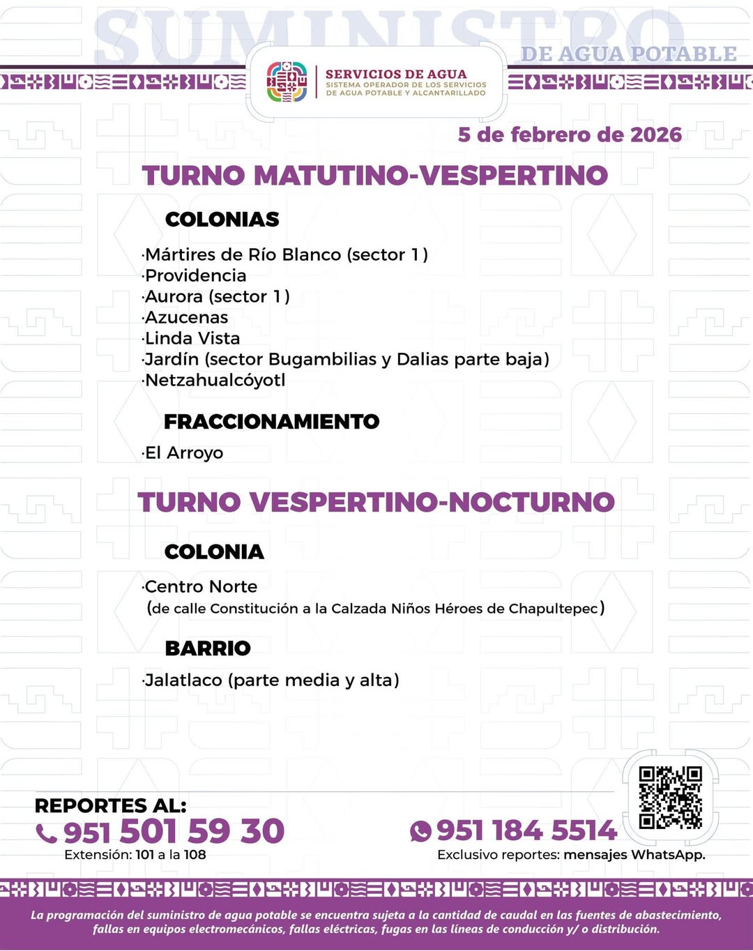 Agenda del suministro de agua potable para este jueves