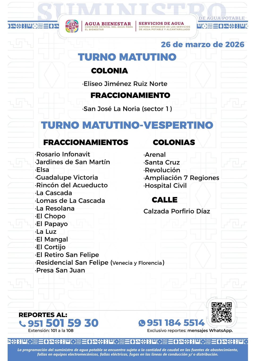 Agenda del suministro de agua potable para este jueves
