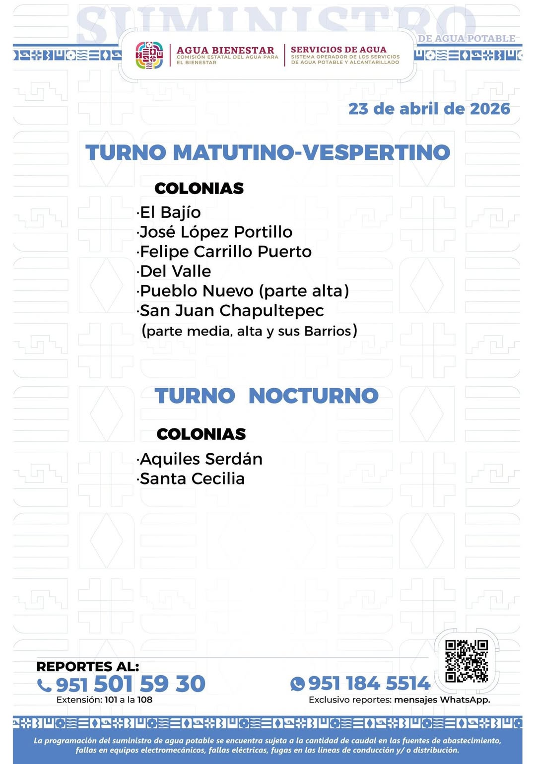 Agenda del suministro de agua potable para este jueves