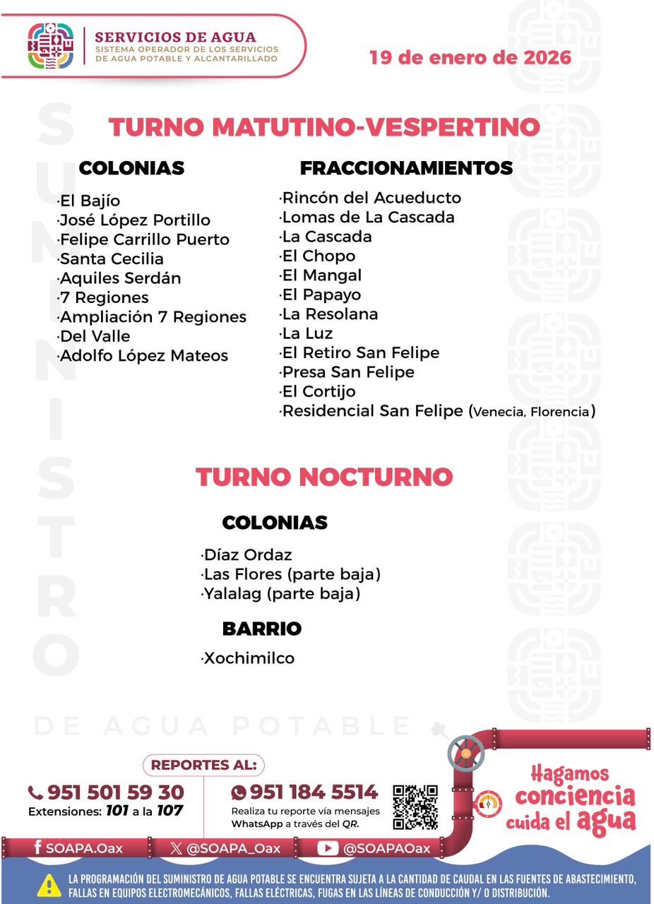 Agenda del suministro de agua potable para este lunes