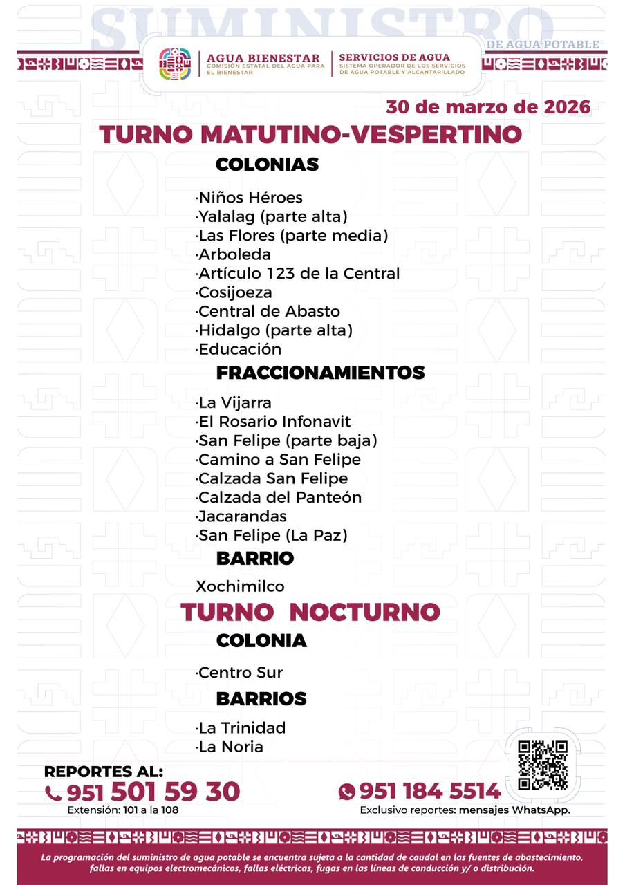 Agenda del suministro de agua potable para este lunes