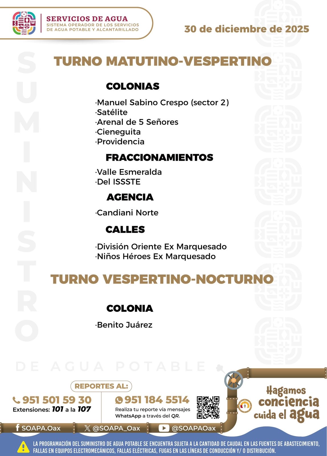 Agenda del suministro de agua potable para este martes