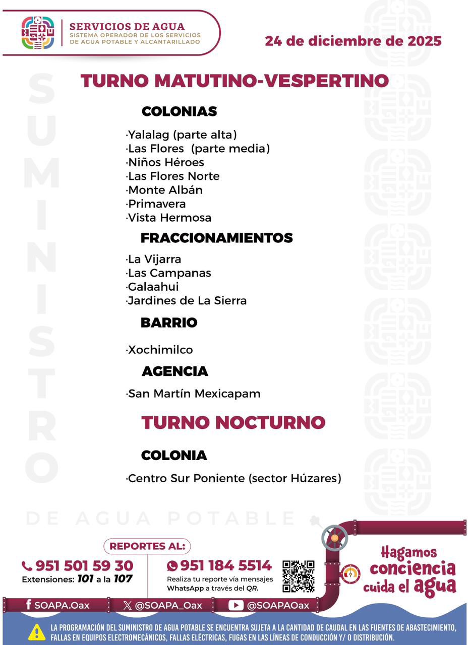 Agenda del suministro de agua potable para este miércoles