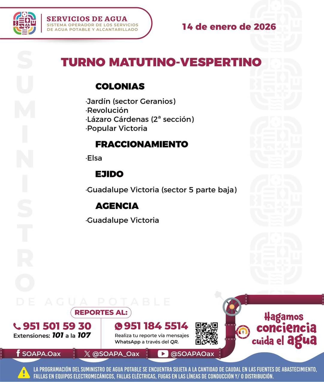 Agenda del suministro de agua potable para este miércoles