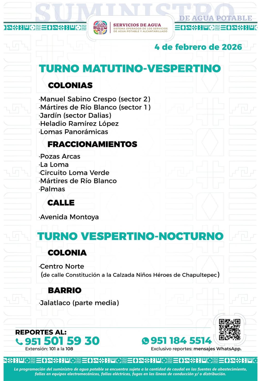 Agenda del suministro de agua potable para este miércoles