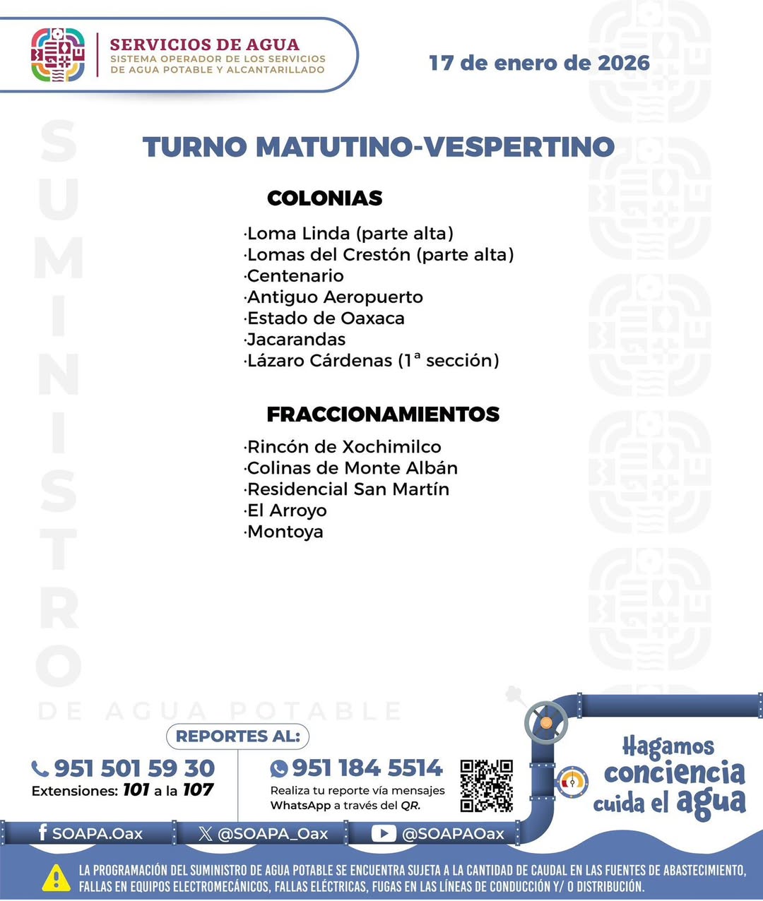 Agenda del suministro de agua potable para este sábado