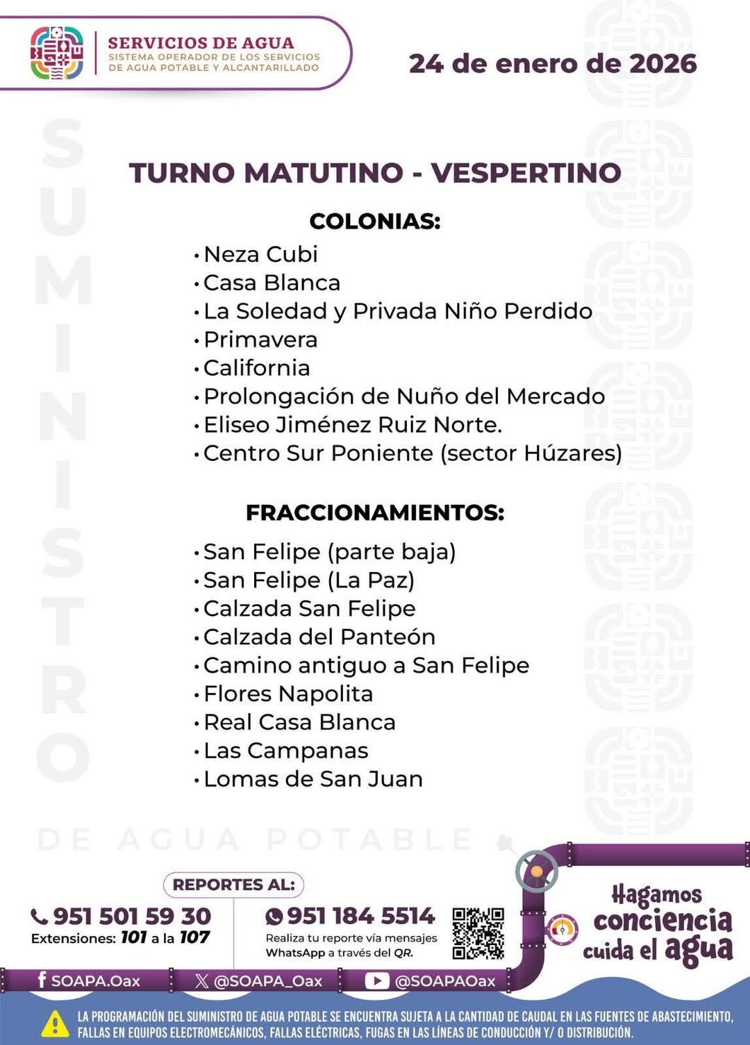 Agenda del suministro de agua potable para este sábado