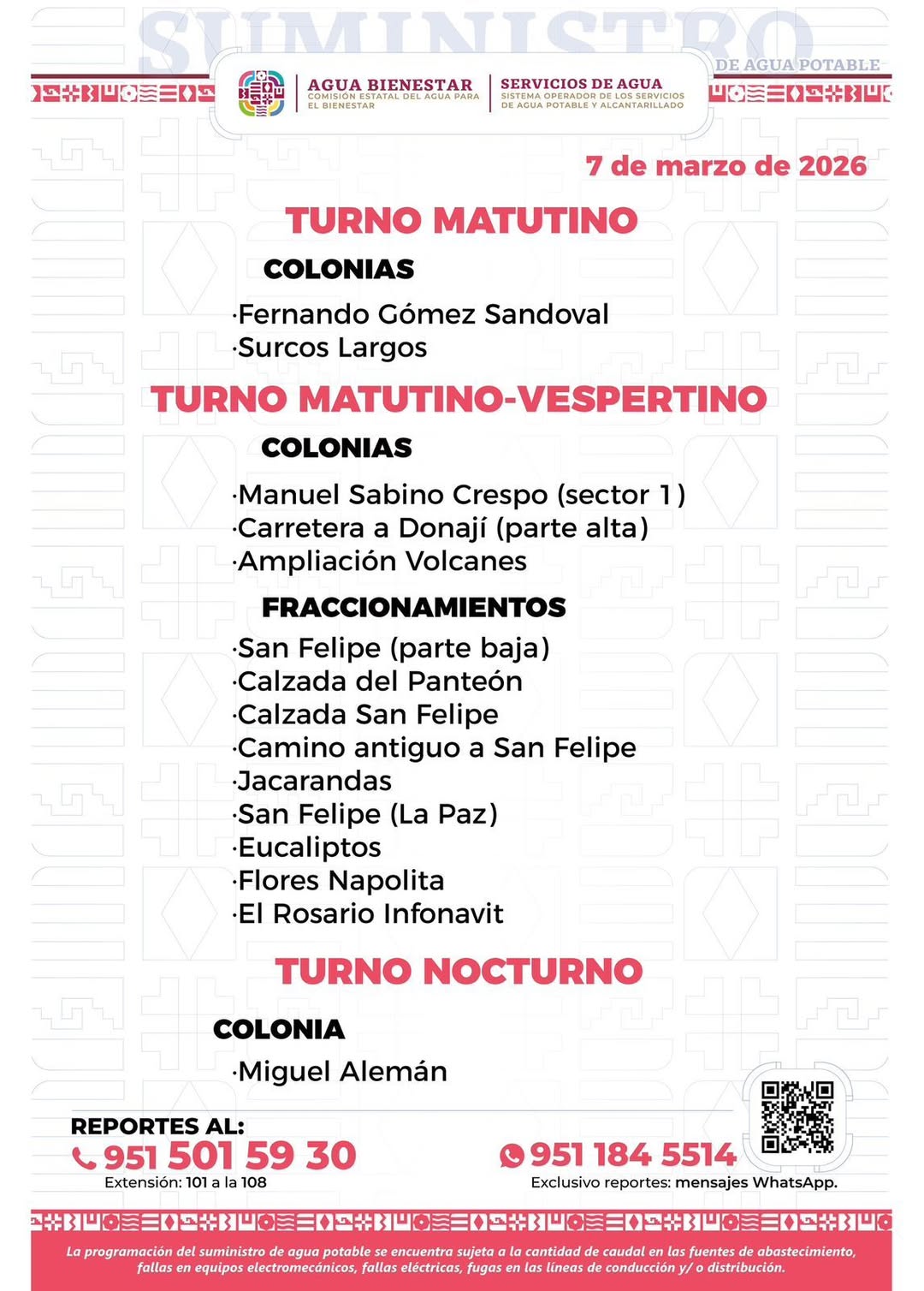 Agenda del suministro de agua potable para este sábado