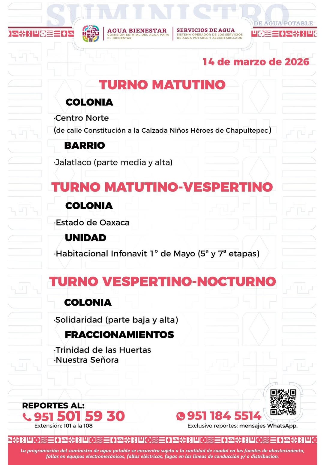 Agenda del suministro de agua potable para este sábado