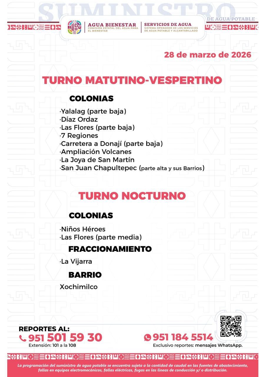 Agenda del suministro de agua potable para este sábado