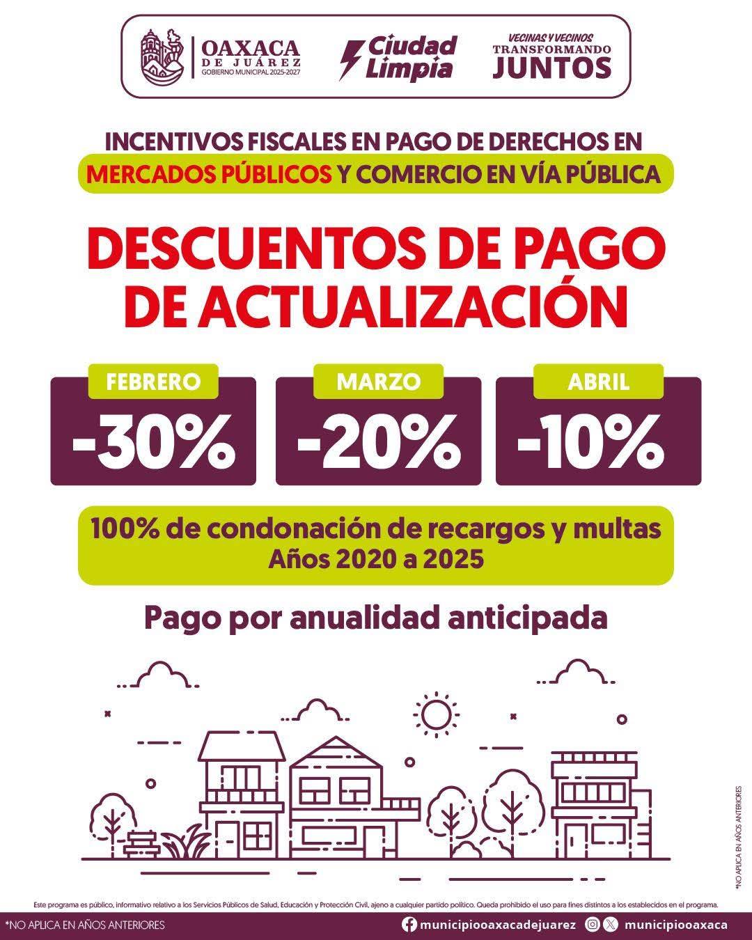 El Cabildo de Oaxaca de Juárez hace un llamado a las y los comerciantes de mercados públicos y del comercio en vía pública para que aprovechen el Programa de Incentivos Fiscales, el cual contempla descuentos vigentes durante los meses de febrero y marzo, así como la condonación del cien por ciento de recargos y multas correspondientes a ejercicios fiscales anteriores, con el propósito de facilitar la regularización, incentivar el cumplimiento de obligaciones y fortalecer la hacienda pública municipal .