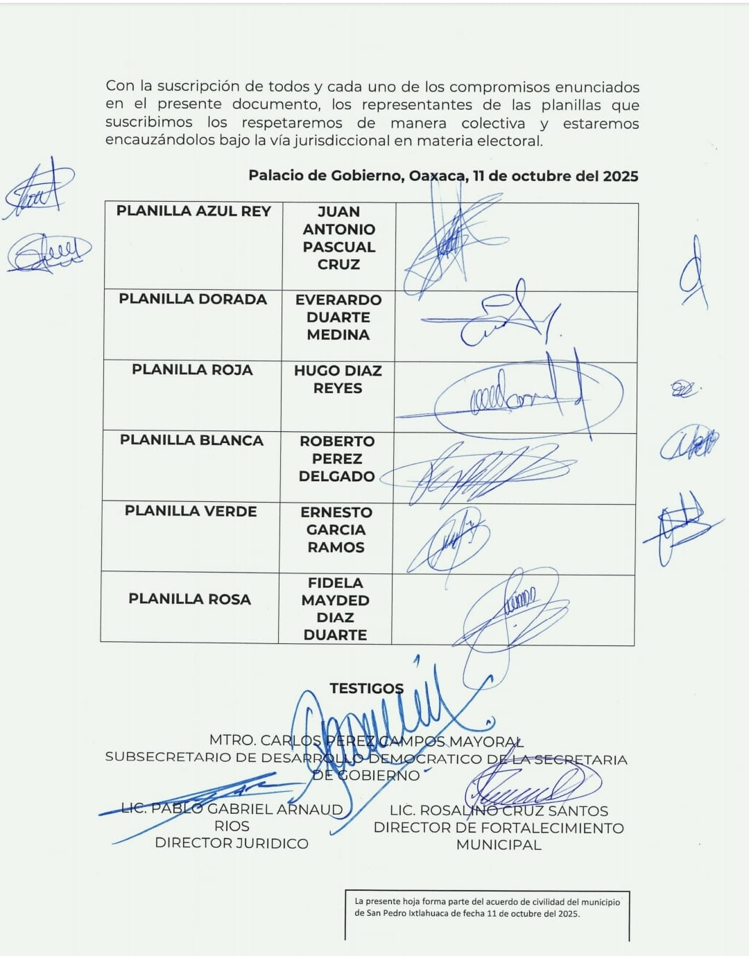 Con este esfuerzo conjunto, la Secretaría de Gobierno y las candidaturas de San Pedro Ixtlahuaca refrendan su voluntad de construir un proceso electoral en armonía, donde la voz de la ciudadanía sea escuchada.