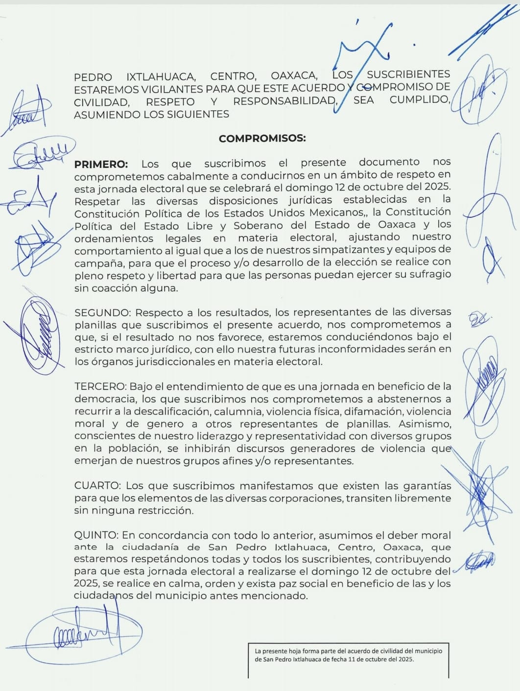 Candidatas y candidatos de San Pedro Ixtlahuaca firman Acuerdo de Civilidad para una jornada electoral en paz  * La Secretaría de Gobierno y autoridades de seguridad acompañarán el proceso para garantizar que la ciudadanía ejerza su voto con libertad y tranquilidad  Oaxaca de Juárez, Oax.– En un ejercicio de diálogo y compromiso con la democracia, las candidatas y los candidatos de San Pedro Ixtlahuaca firmaron este sábado el Acuerdo de Civilidad y Seguridad, con el que se comprometieron a que la jornada el
