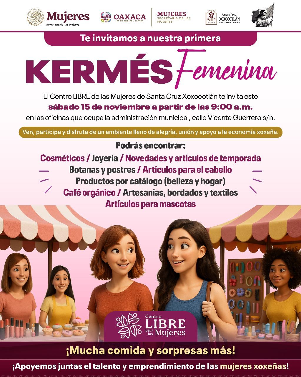Con el respaldo del Ayuntamiento, el Centro LIBRE de las Mujeres de Xoxocotlán realizará el próximo sábado 15 de noviembre, la primera Kermés Femenina, cuyo propósito es fomentar la convivencia, la unión comunitaria y el apoyo a la economía local, especialmente a las mujeres emprendedoras del municipio.