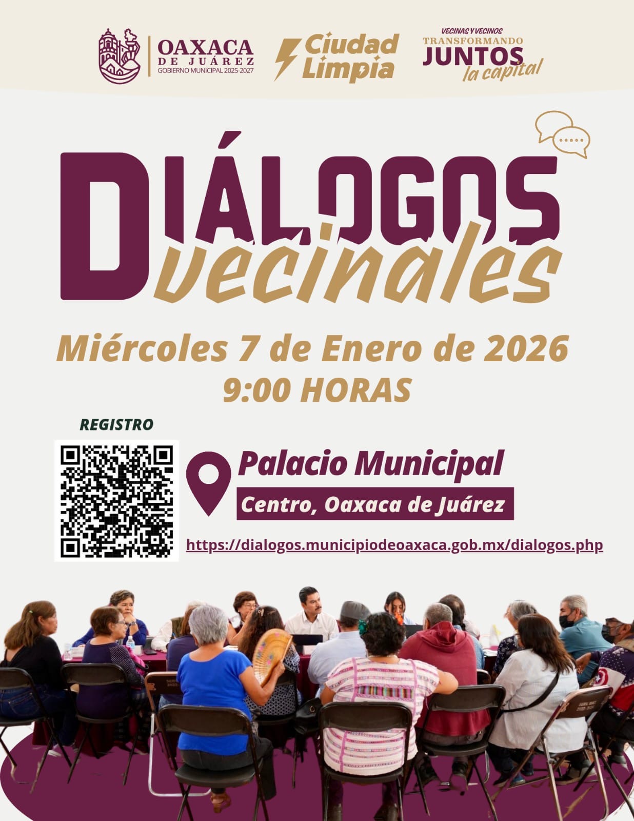 Con el propósito de fortalecer la participación ciudadana y consolidar un gobierno cercano, el Municipio de Oaxaca de Juárez, encabezado por el presidente Ray Chagoya, llevará a cabo el primer Diálogo Vecinal del año, el cual se realizará en el Palacio Municipal de Oaxaca de Juárez, ubicado en el Centro Histórico de la ciudad.