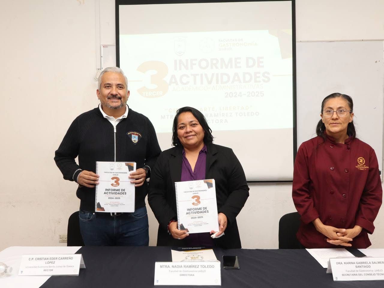 La consolidación académica, que se refleja en la creación de la Maestría en Gestión Gastronómica, su elevación al rango de facultad y el crecimiento de su matrícula estudiantil en más del 38 por ciento, fueron algunos de los logros presentados durante el Tercer Informe de Actividades de la Maestra Nadia Ramírez Toledo, directora para el período 2022-2025, de la Facultad de Gastronomía de la Universidad Autónoma “Benito Juárez” de Oaxaca.