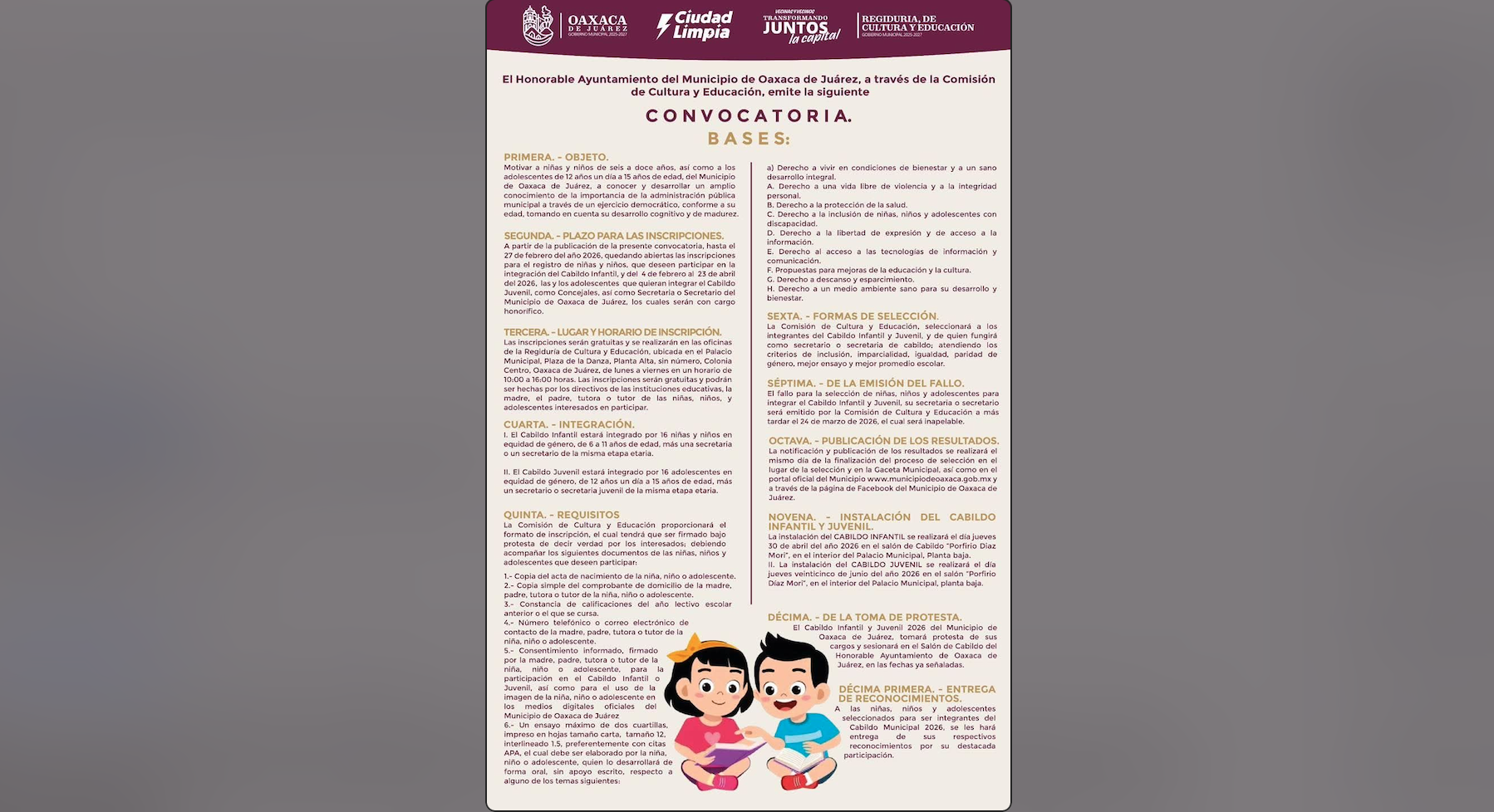 El Honorable Ayuntamiento de Oaxaca de Juárez, a través de la Comisión de Cultura y Educación, emitió la convocatoria para integrar el Cabildo Infantil y Juvenil 2026, con el objetivo de promover la participación activa de niñas, niños y adolescentes en la vida pública del municipio.