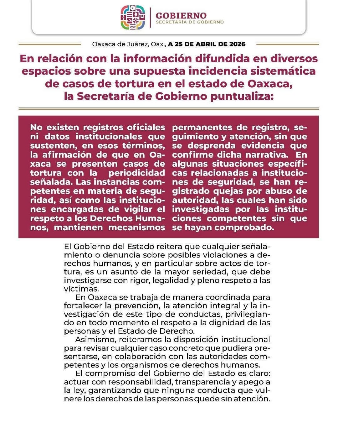 El Gobierno del Estado de Oaxaca, a través de la Secretaría de Gobierno, rechazó que exista una incidencia sistemática de casos de tortura en la entidad, como ha sido señalado en algunos espacios y aseguró que no hay registros oficiales ni datos institucionales que respalden dicha afirmación en los términos planteados.