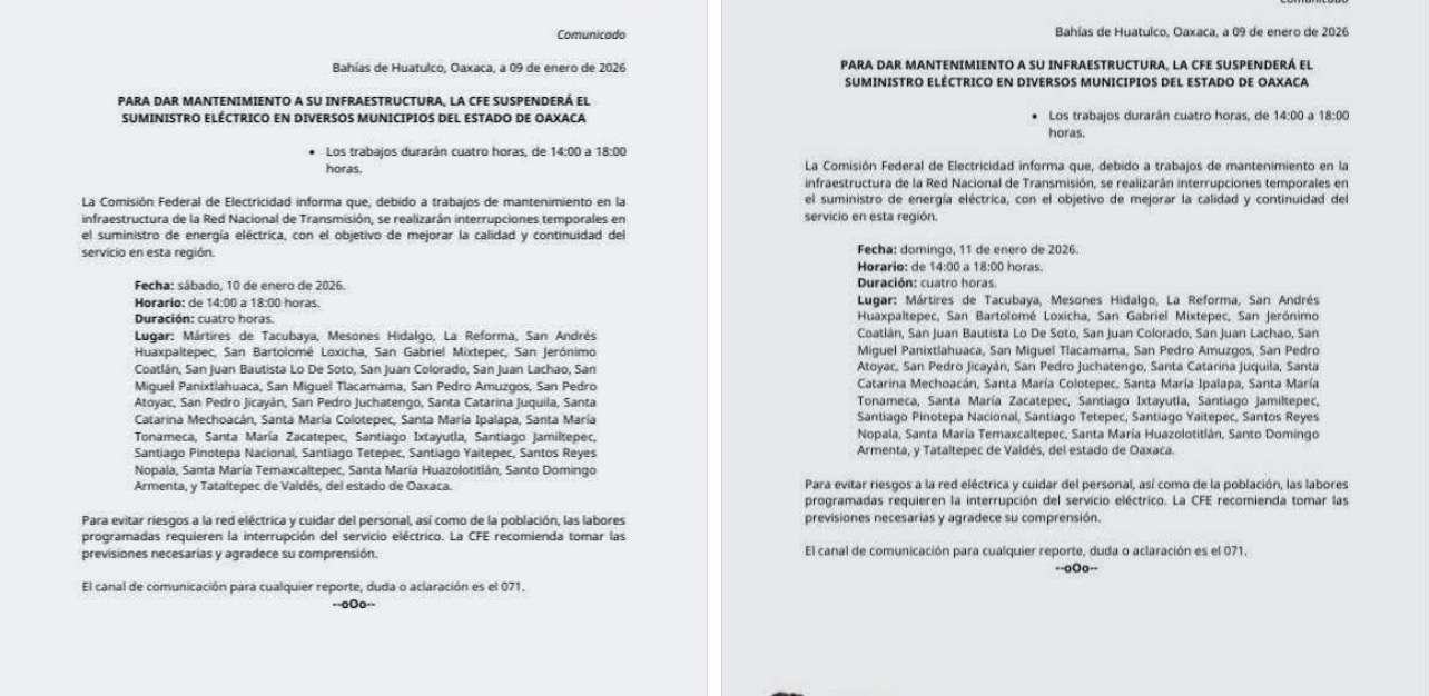 Este sábado 10 y domingo 11 de enero la Comisión Federal de Electricidad suspenderá el suministro eléctrico de 14 a 18 horas en varios municipios del estado, principalmente de la costa.