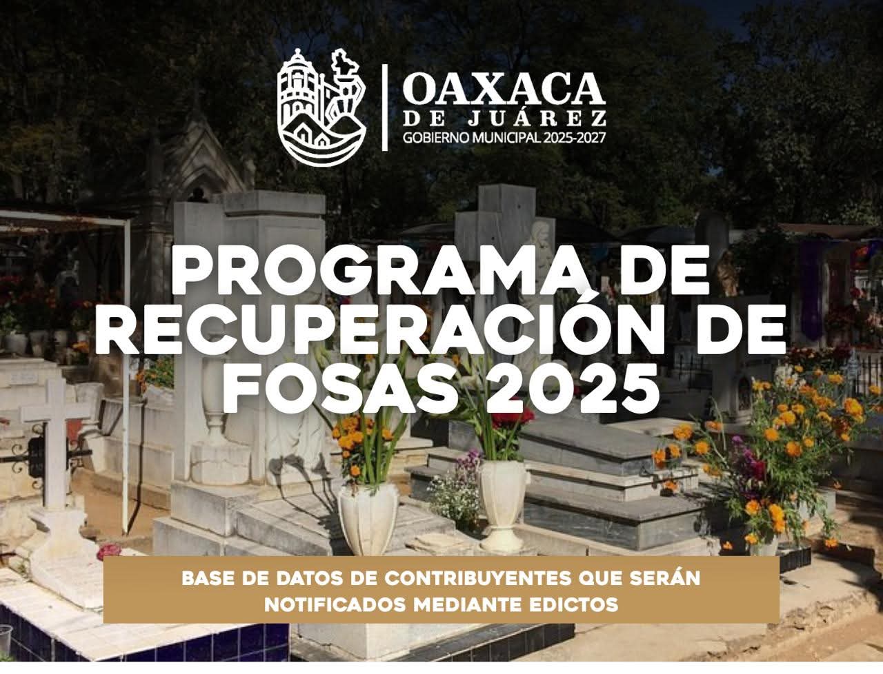El Municipio de Oaxaca de Juárez, a través de la Comisión de Servicios Vecinales, Espectáculos y Transparencia, la Secretaría de Servicios Vecinales y la Unidad de Panteones, informa al público en general el inicio del Programa de Recuperación de Fosas 2025, con el objetivo de fomentar la conservación y mantenimiento de los panteones municipales.