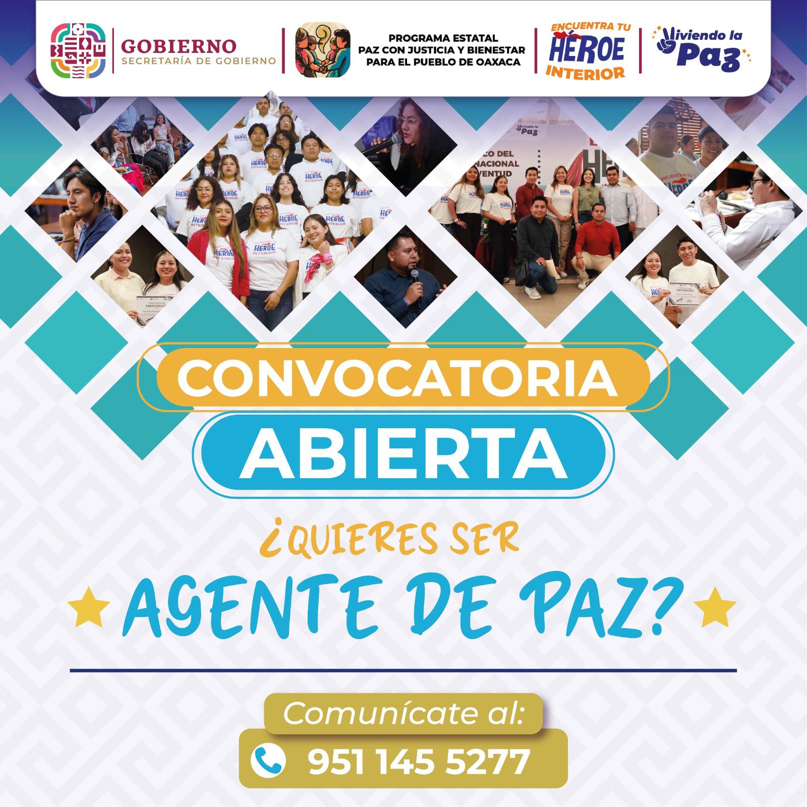 La Secretaría de Gobierno del Estado de Oaxaca (Sego) lanza la segunda convocatoria del programa “Agentes de Paz”, dirigida a las juventudes oaxaqueñas comprometidas con la transformación social y la construcción de entornos más armónicos.